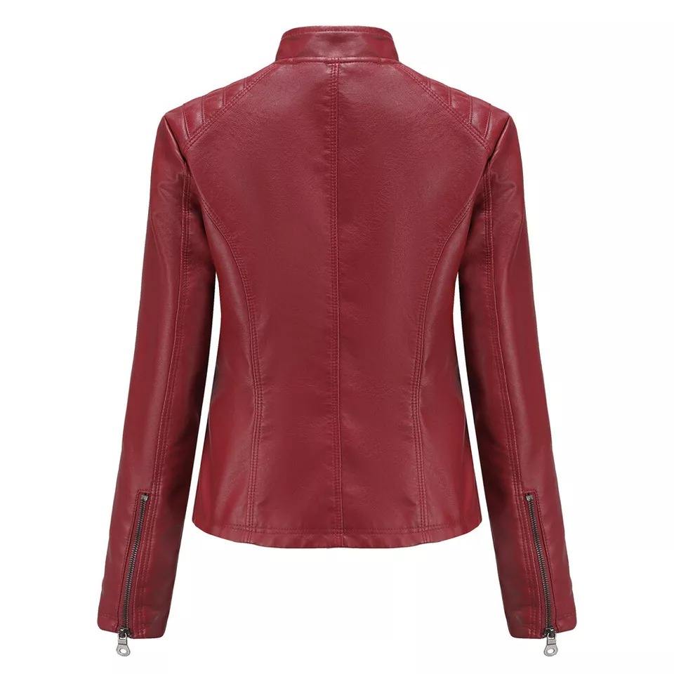 Moto แจ็คเก็ตหนังเทียมสำหรับผู้หญิง, เสื้อโค้ทสั้นมีซิปคอตั้งแจ๊กเก็ตหนัง MS-LJ-0077