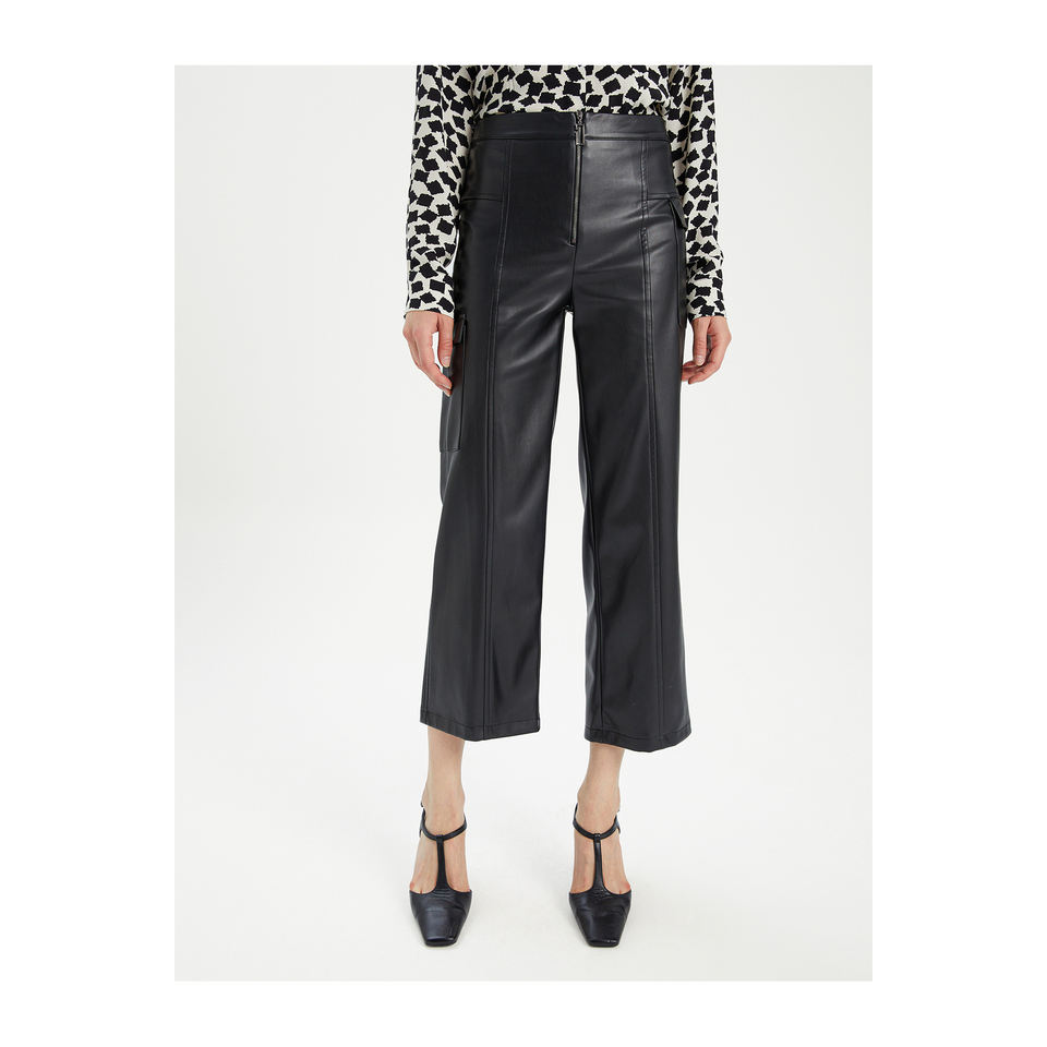 กางเกงขายาวทรงกระบอกหนังเทียมสำหรับผู้หญิง พร้อมดีเทลกระเป๋าแบบไม่สมมาตร และเข็มขัด/สายคาดเอวแบบโค้ง