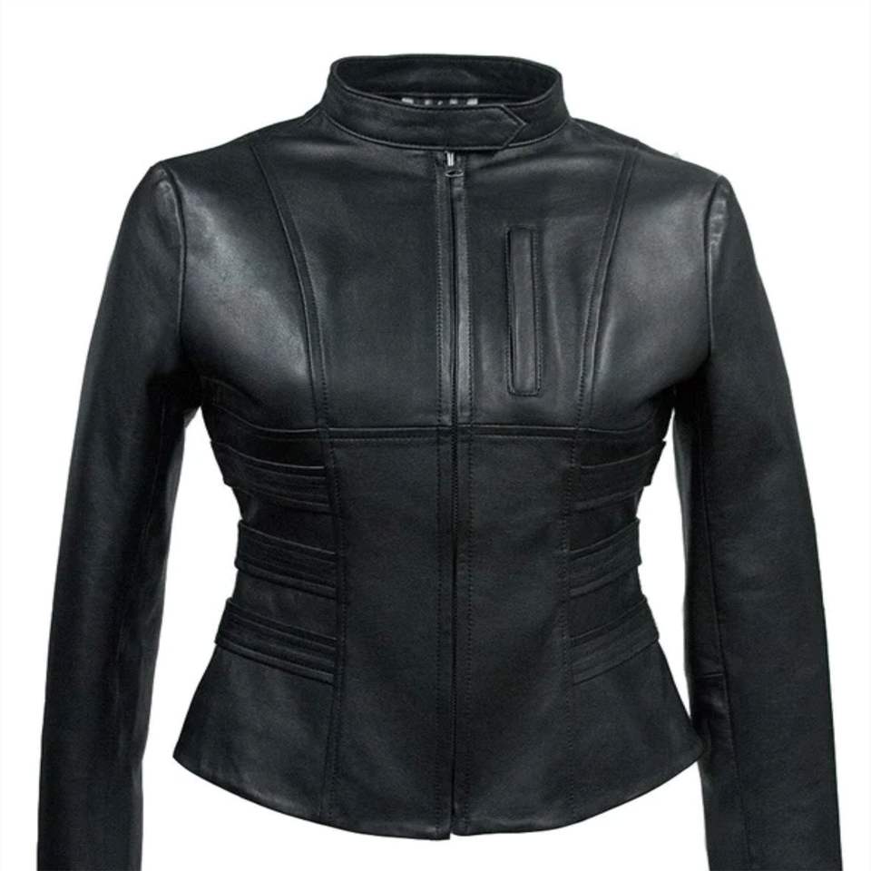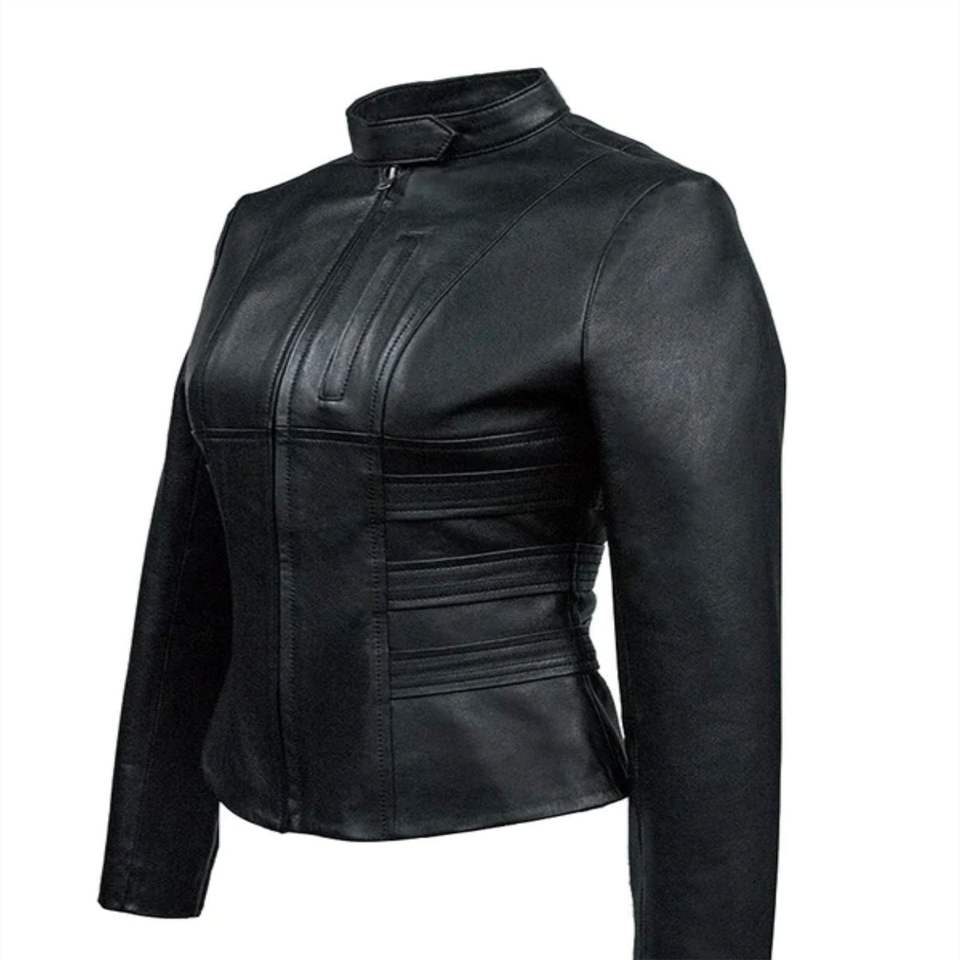แจ็กเก็ตหนังเข้ารูปของผู้หญิงมีสไตล์และดีไซน์เพรียวบางพร้อมหนังแท้พรีเมี่ยมเพื่อลุคที่ทันสมัย