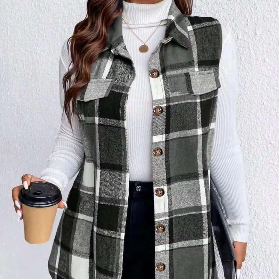 Women's Flap Detail Sleeveless Coat with Plaid Print Thick Thermal Vest Outwear Long Denim Fabric Ladies' Fashion