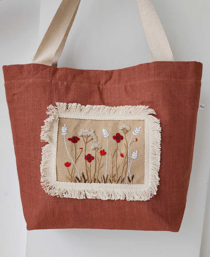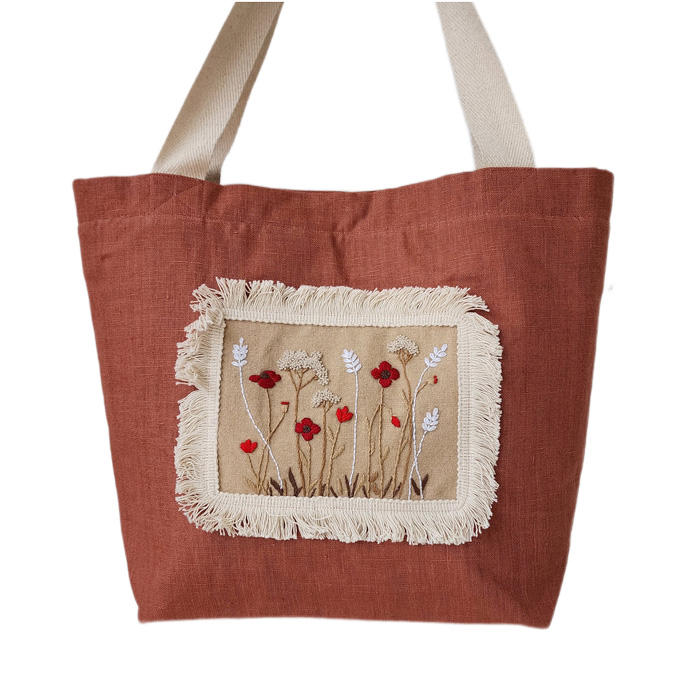ผู้หญิงดอกไม้ปักผ้าลินินกระเป๋าออกแบบที่กําหนดเองมือปักร้านขายของชําช้อปปิ้งกระเป๋าสะพาย