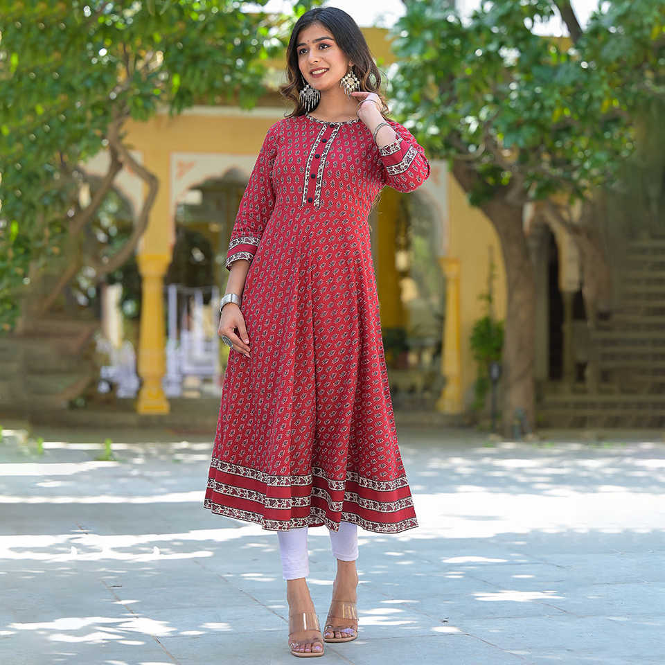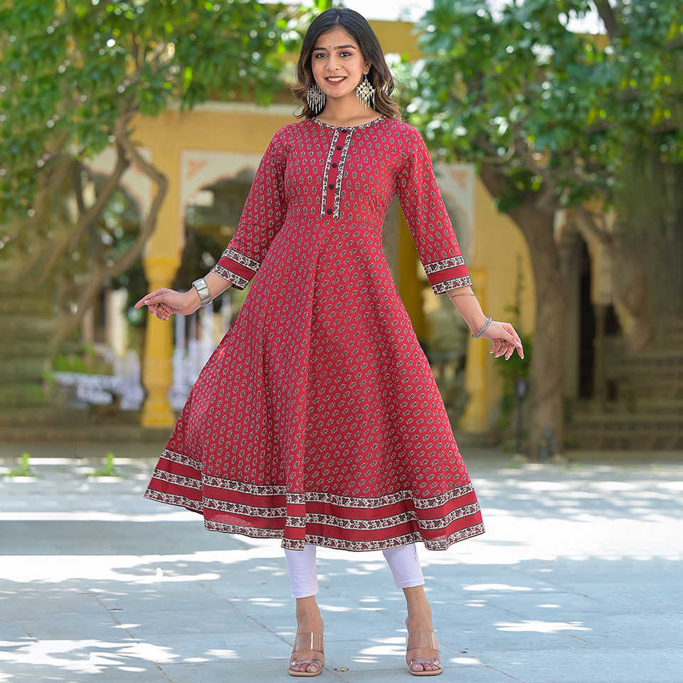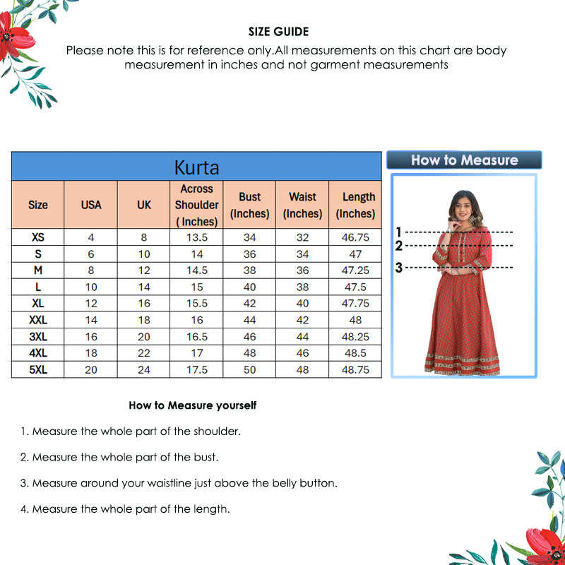 ชุดคุรตาอานาร์กาลีผ้าฝ้ายพิมพ์ลายดอกไม้สำหรับผู้หญิง สีมารูน ขนาด 48 นิ้ว XXL-5XL