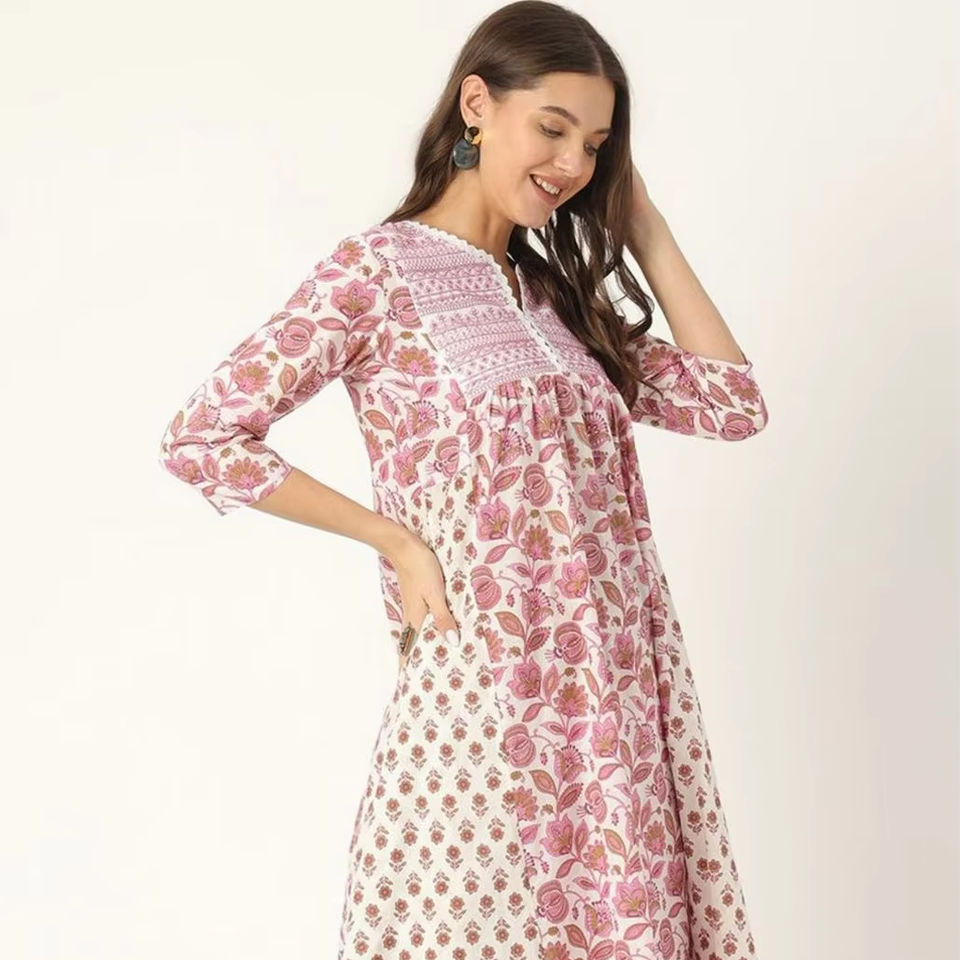 Women's Floral Print Cotton Kurta with Pants Set Half Sleeves V-Neck Party Wear for Women Casual Wear