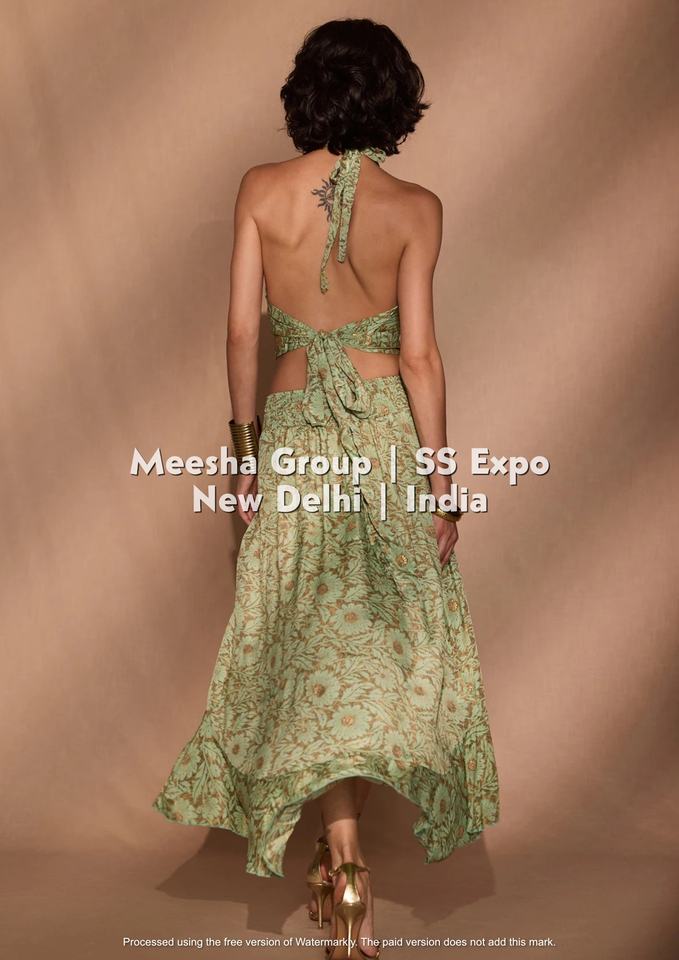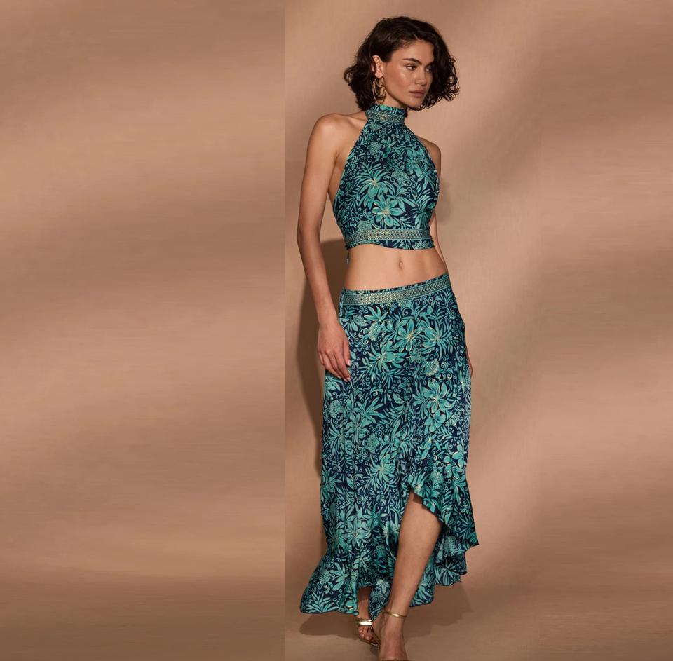 ชุดเซ็ตเสื้อครอปผูกหลังพิมพ์ลายดอกไม้สำหรับผู้หญิง พร้อมกระโปรงระบายชายสูงต่ำ ชุดสองชิ้น - คละสี