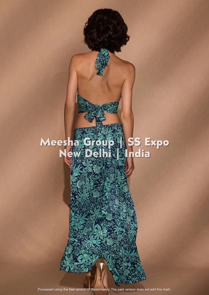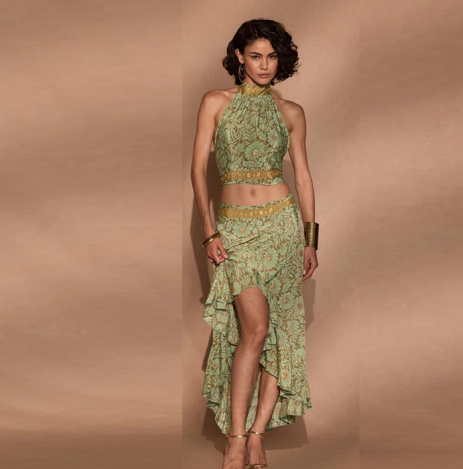 ชุดเซ็ตเสื้อครอปผูกหลังพิมพ์ลายดอกไม้สำหรับผู้หญิง พร้อมกระโปรงระบายชายสูงต่ำ ชุดสองชิ้น - คละสี