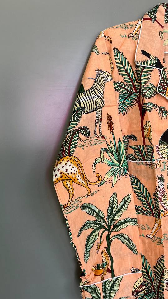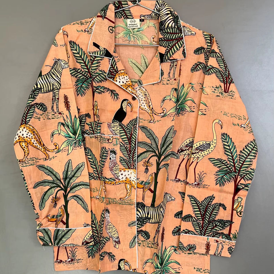 Women's Floral Vertical Stripe Handmade Printed Cotton Pajama Set Summer Spring Quick Dry Lounge Wear Stylish Striped Long
