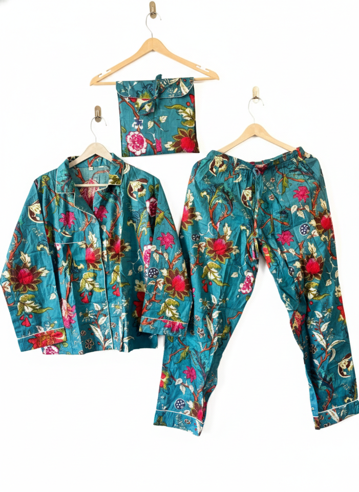 ชุดนอนผ้าฝ้ายพิมพ์ลายดอกไม้ลายทางแนวตั้งแขนยาวสำหรับผู้หญิง ทำมือ 100% ผ้าฝ้าย แห้งเร็ว ใส่สบาย เหมาะสำหรับฤดูร้อนและฤดูใบไม้ผลิ ดีไซน์ทันสมัย