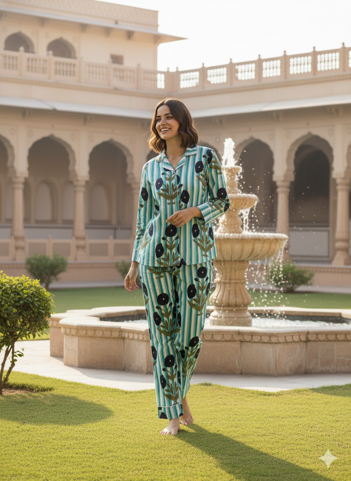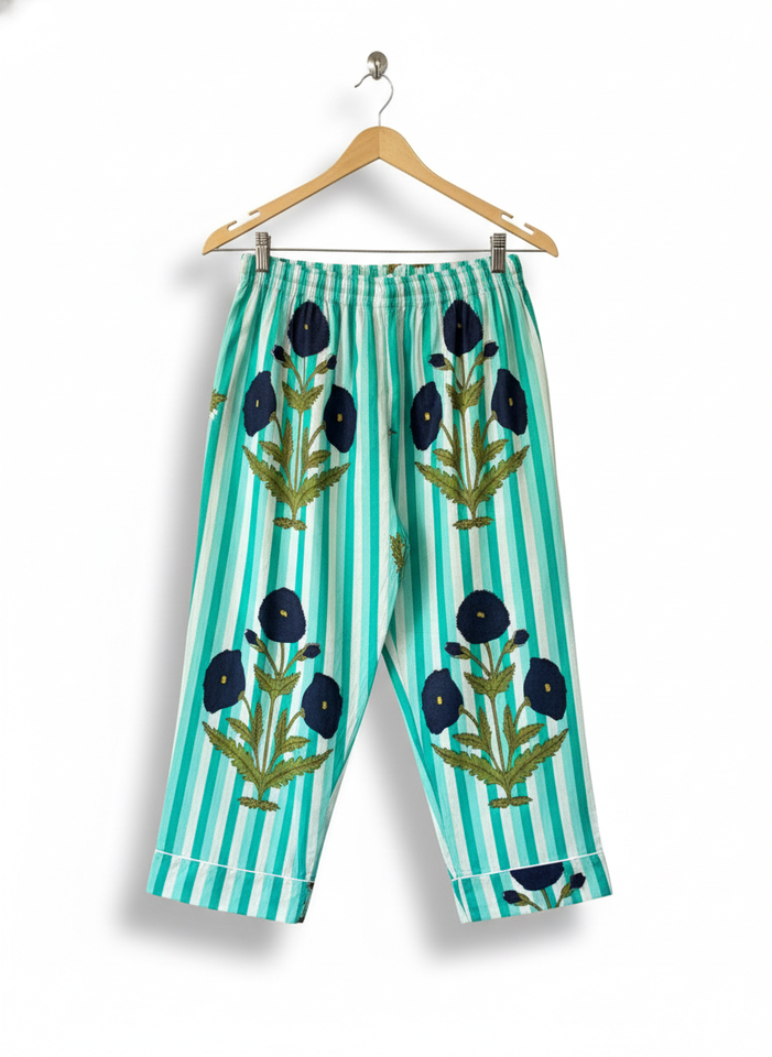 ชุดนอนฤดูร้อนลายดอกไม้แนวตั้งสำหรับผู้หญิง ชุดลำลองผ้าฝ้าย เสื้อและกางเกงขายาว แห้งเร็ว ทันสมัย