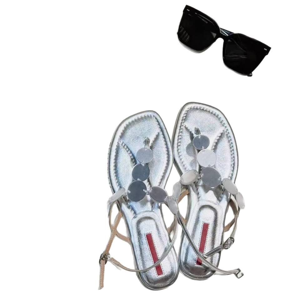 รองเท้าแตะสไตล์โรมันแบบสวมสำหรับผู้หญิง ดีไซน์หรูหราแบบฝรั่งเศส หนังแท้ สีเงินแบบกระจกเงา รองเท้าแตะแบบเรียบสำหรับใส่ไปชายหาด ใช้งานได้หลากหลาย