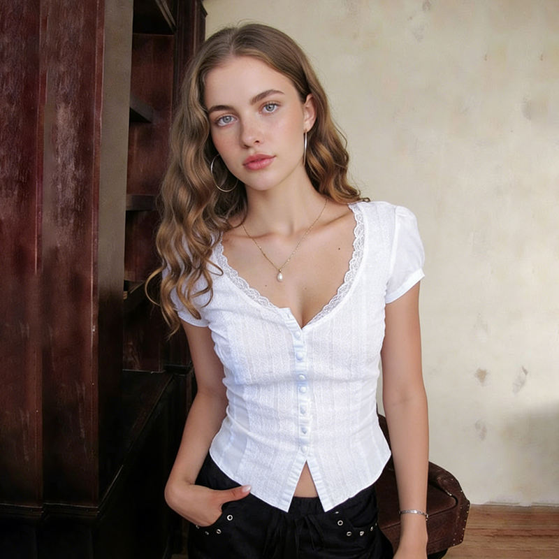 เสื้อแขนสั้นผู้หญิงสไตล์ฝรั่งเศส ผ้าลูกไม้ แขนพอง คอวี ทรงเข้ารูป เสื้อฤดูร้อน แฟชั่นหรูหรา