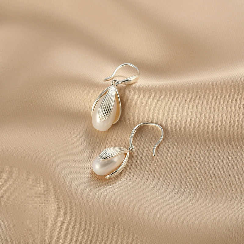 ต่างหูมุกน้ำจืดทรงดอกแมกโนเลียสำหรับผู้หญิง ดีไซน์ทรงหยดน้ำยาว
