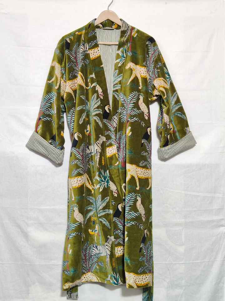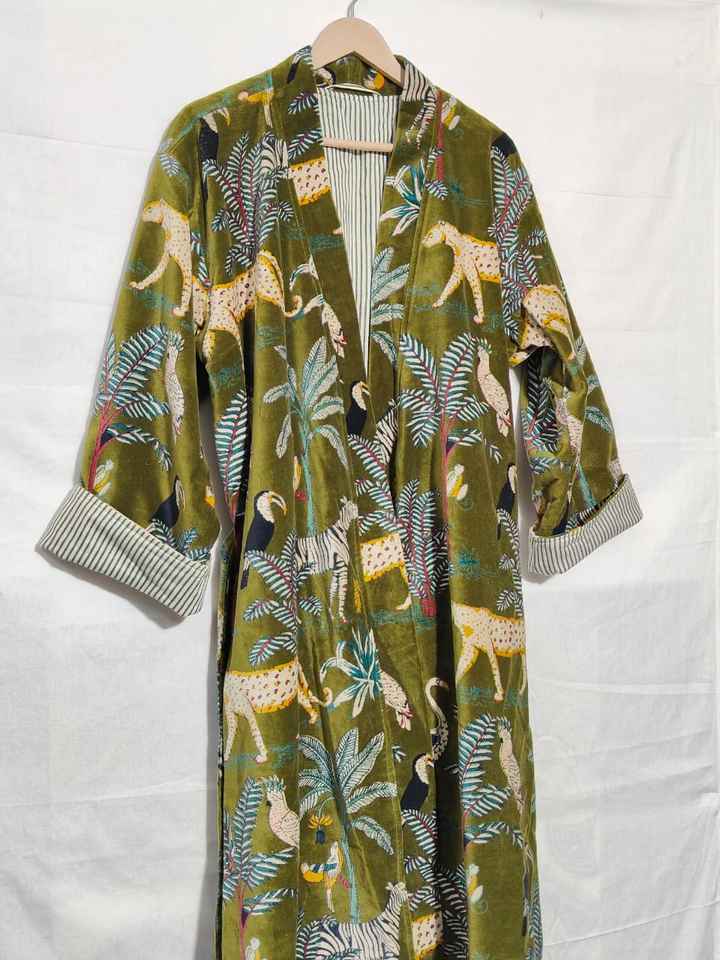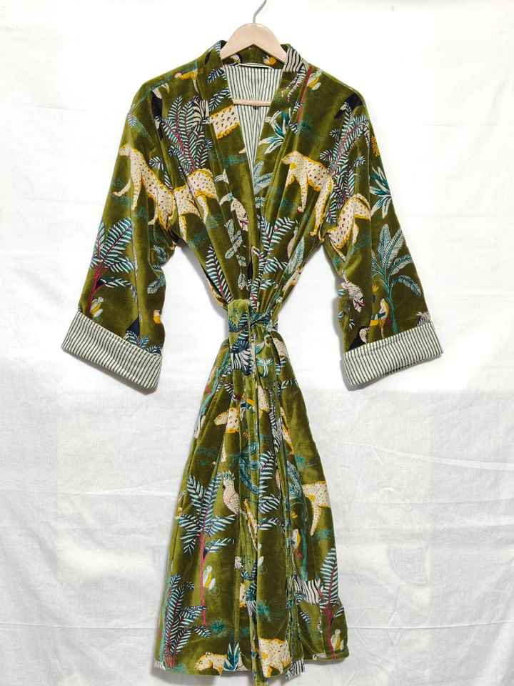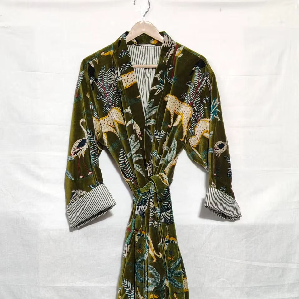 ชุดคลุมกิโมโนกำมะหยี่พิมพ์ลายสัตว์ป่า คอวี ยาวเต็มตัว สำหรับผู้หญิง ให้ความอบอุ่นในฤดูหนาว ผ้าเนื้อนุ่ม ซักเครื่องได้