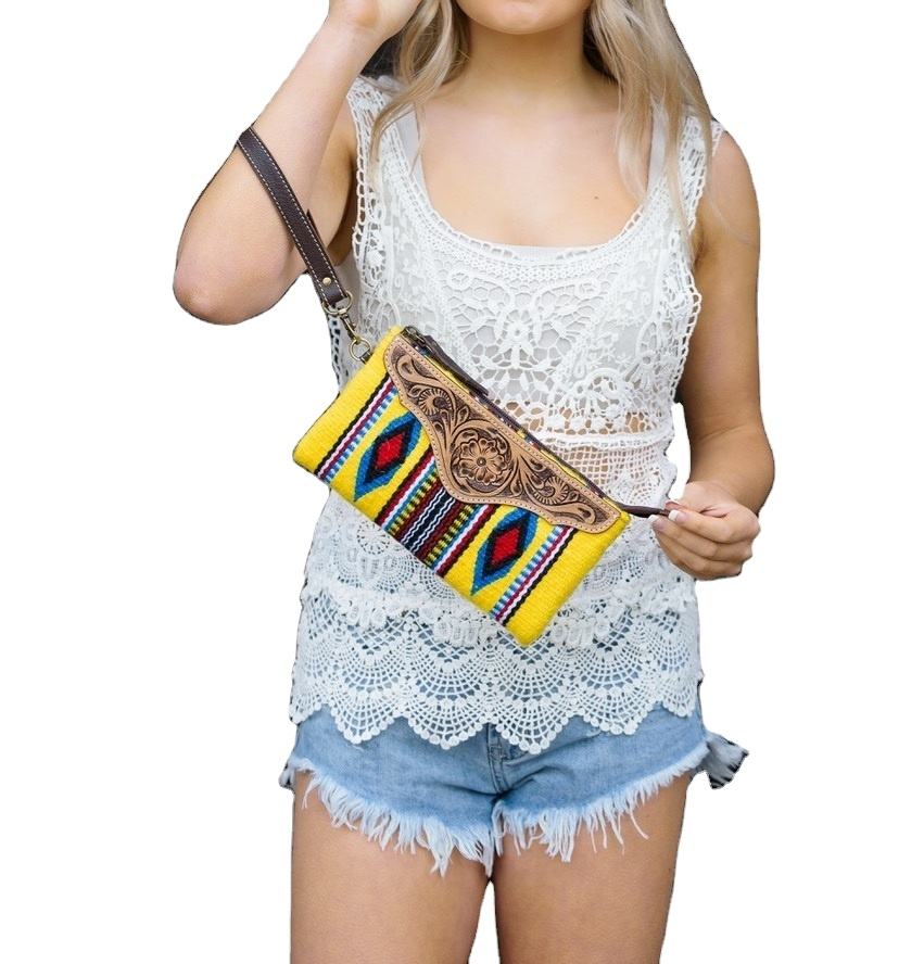Women's Genuine Leather Bohemian Western Clutch Bag Yellow Saddle Blanket Design Hand Tooling Zipper Removable Winter Spring
