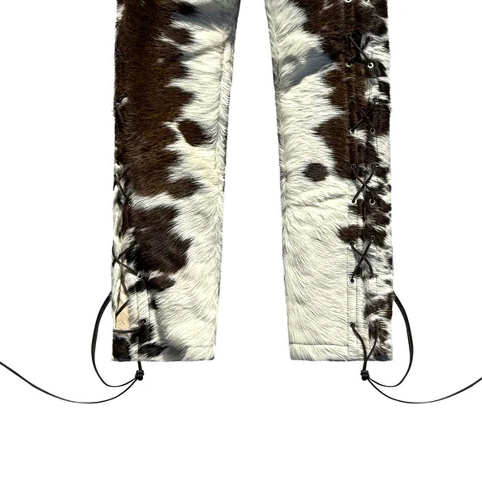 กางเกงหนังแท้สตรีทแวร์สำหรับฤดูหนาว คุณภาพสูง สีสันปรับแต่งได้ ผลิตด้วยมือจากหนังวัวมีขน ผลิตในปากีสถาน