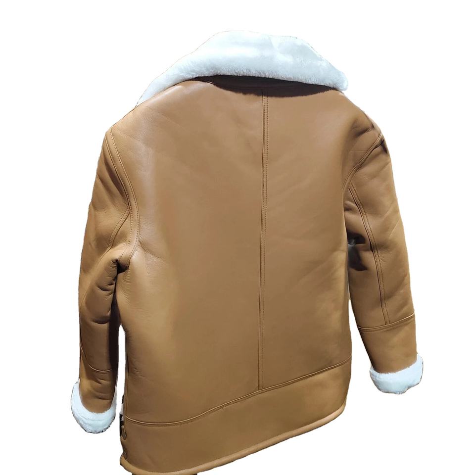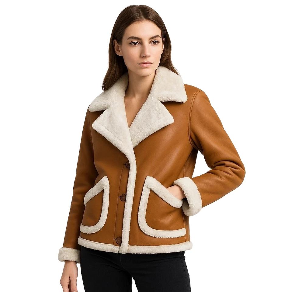 แจ็คเก็ตบอมเบอร์หนังแกะแท้สำหรับผู้หญิง พร้อมขนเฟอร์เทียมถักแบบ Shearling ย้อมสีและโลโก้ตามสั่ง