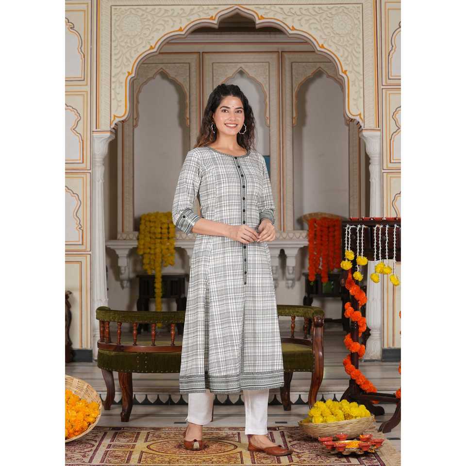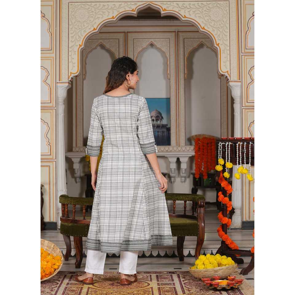 ชุดคุร์ตาอานาร์กาลีผ้าฝ้ายพิมพ์ลายเรขาคณิตสำหรับผู้หญิง สีขาว ขนาด 48 นิ้ว ใส่สบาย ไซส์ XXL-8XL
