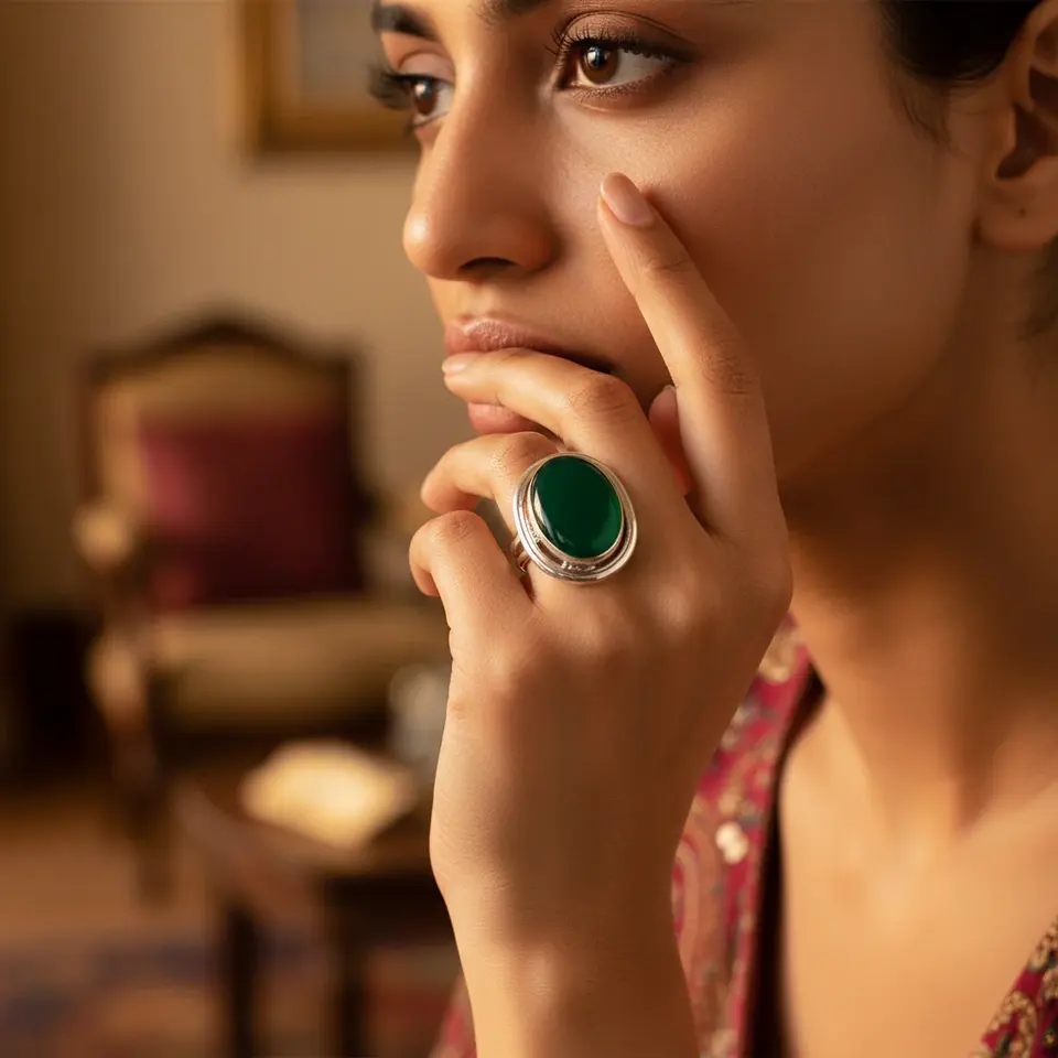 Women's Geometric White Gold Ring with Rhodium Plated Oval Cut Green Onyx Silver Zircon Gemstone Jewelry