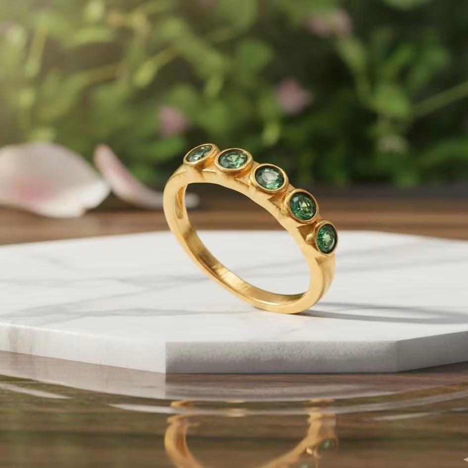 แหวนมรกตทรงกลมแบบฝังขอบคลาสสิก เงินแท้ 925 ชุบทองสำหรับเด็ก
