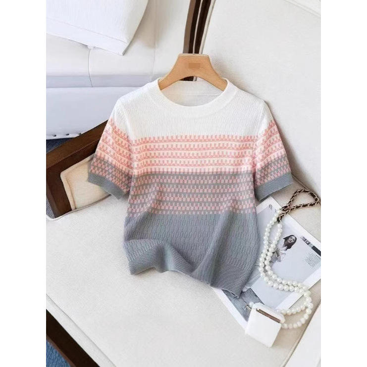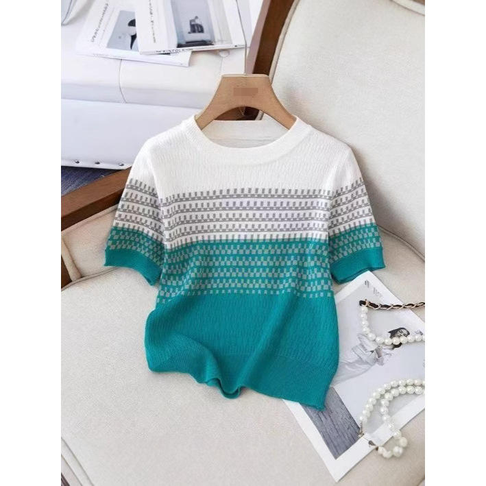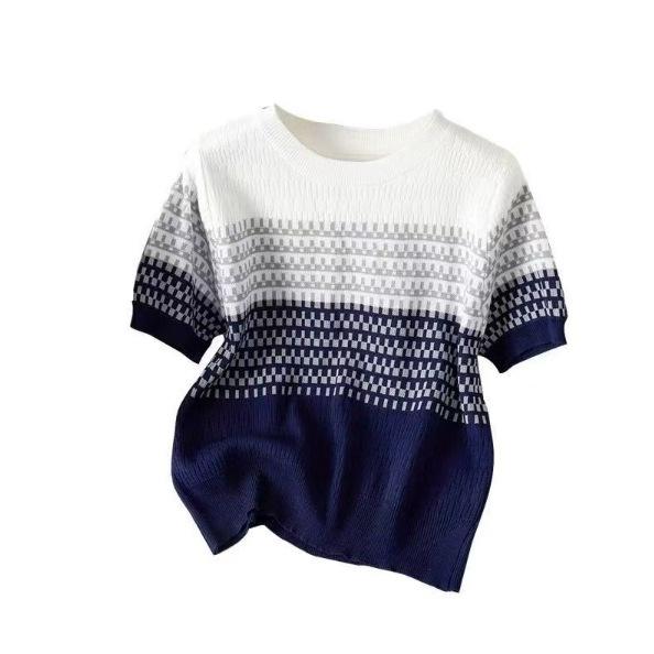 เสื้อถักลายทางไล่เฉดสีสำหรับผู้หญิง แขนสั้น คอเสื้อนุ่ม ผ้ายืดสแปนเด็กซ์/ผ้าฝ้าย แฟชั่นฤดูร้อน เสื้อคลุมบาง สีเทา น้ำเงิน เขียว