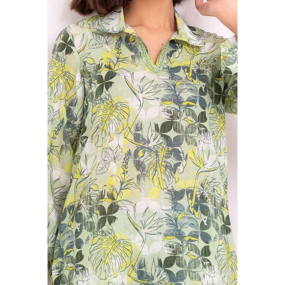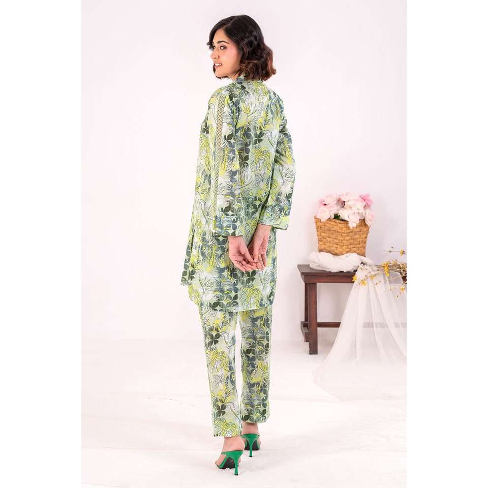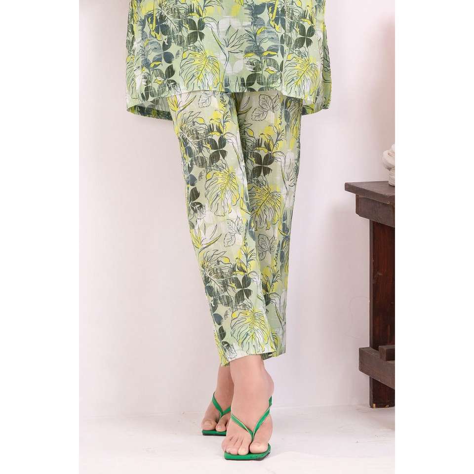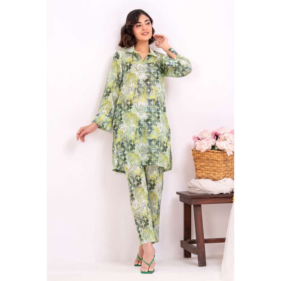 ชุดสูทผ้าลอนพิมพ์ลายสีเขียวสำหรับผู้หญิงแบบ 2 ชิ้น ไม่เย็บติดกัน พร้อมตกแต่งกระดุม