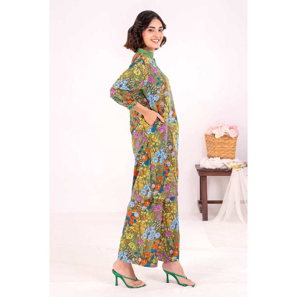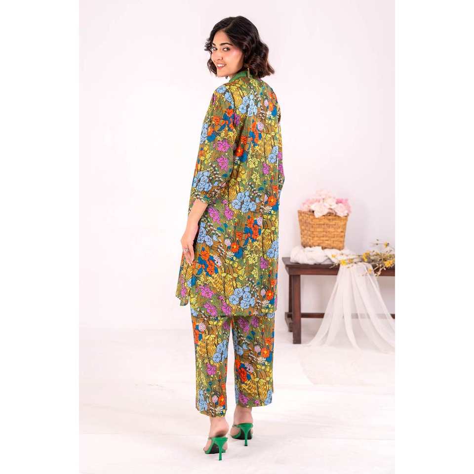 ชุดสูทผ้าลอนพิมพ์ลายสีเขียวสำหรับผู้หญิงแบบ 2 ชิ้น ไม่เย็บติดกัน พร้อมตกแต่งกระดุม
