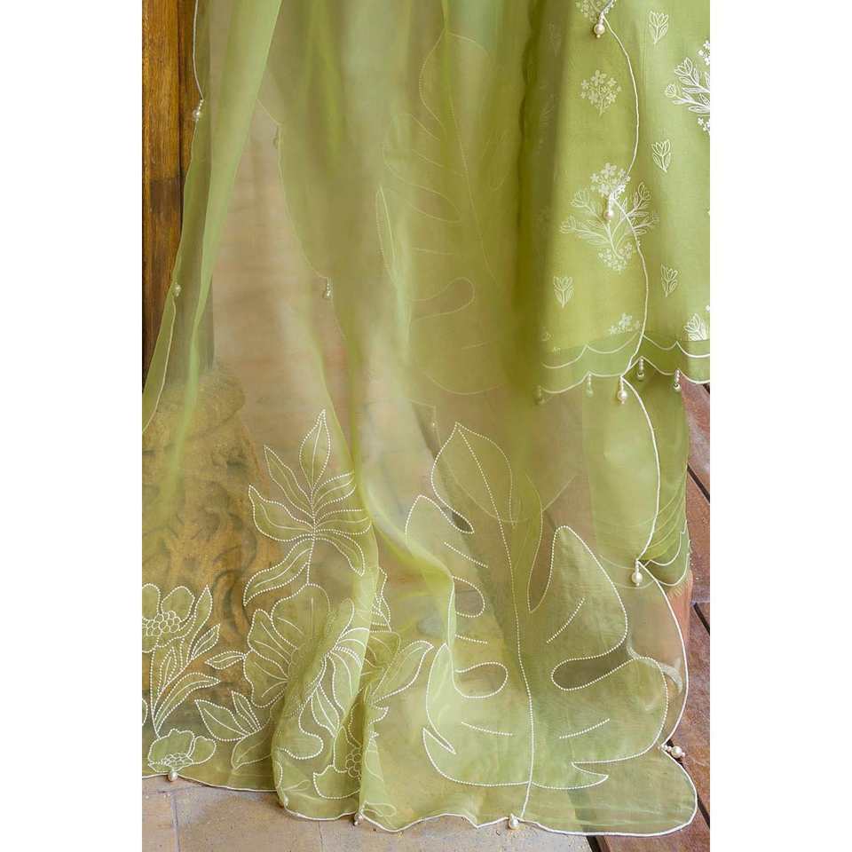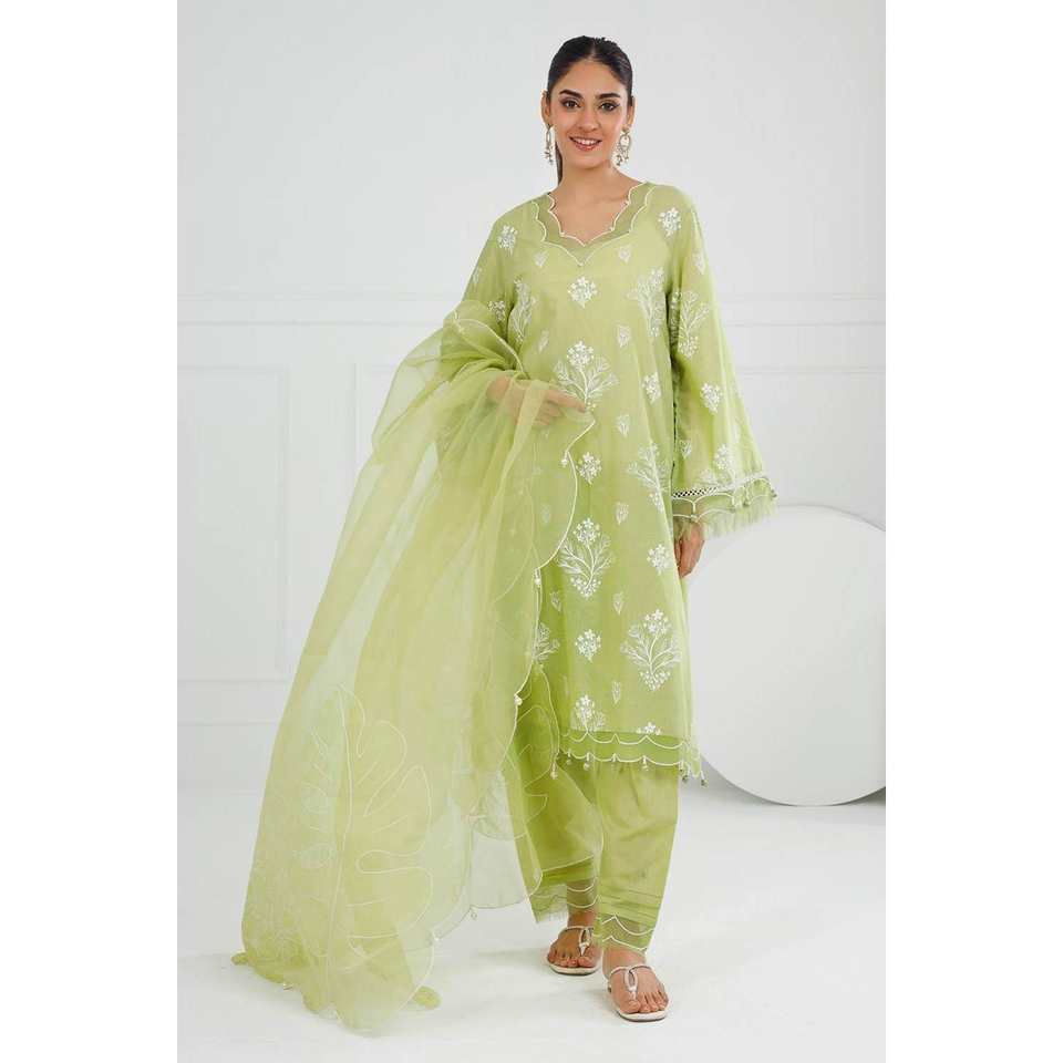 ชุดผ้าชีฟองสีเขียวแบบ 3 ชิ้นสำหรับผู้หญิง สำหรับฤดูใบไม้ผลิ/ฤดูร้อน (แบบยังไม่ได้เย็บ)