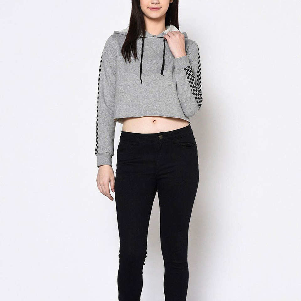 เสื้อฮู้ดครอปสีเทาสำหรับผู้หญิง แขนยาว สไตล์ลำลองสำหรับฤดูหนาว มีเชือกผูก ผลิตจากวัสดุรักษ์โลก สีพื้น