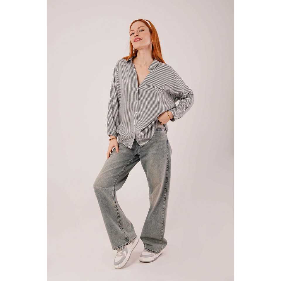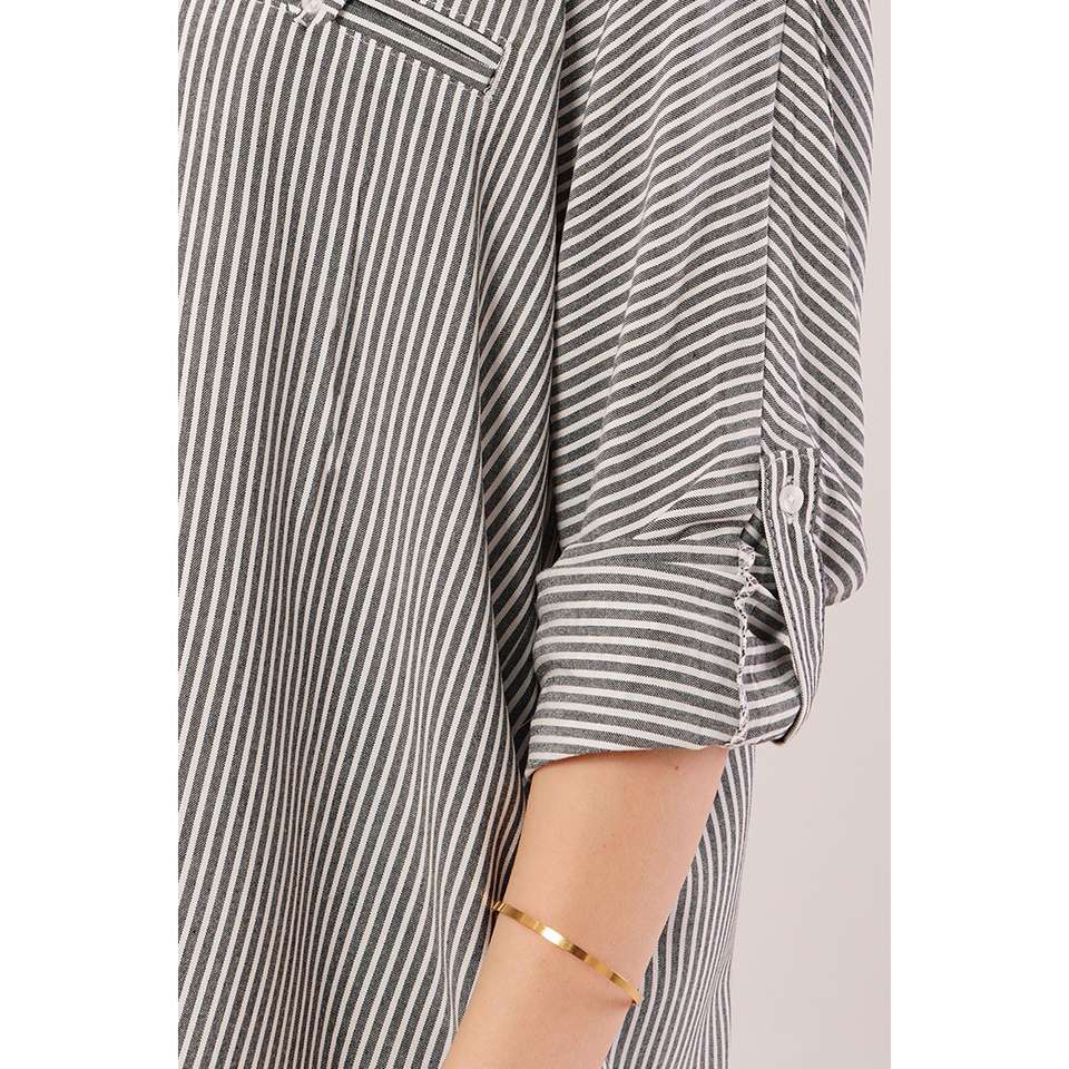 Women's Grey Oversize Striped Pocket Detail Wholesale Blouses & Shirts