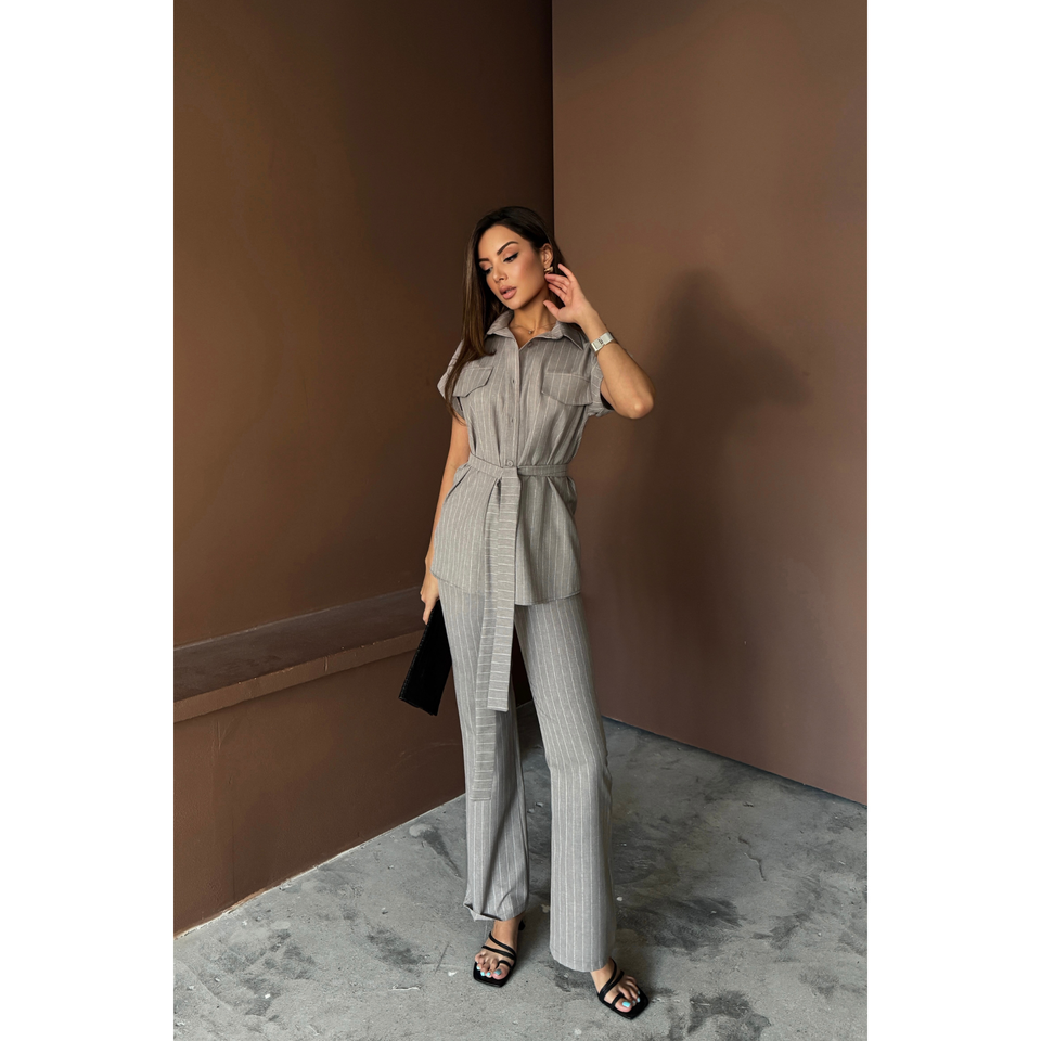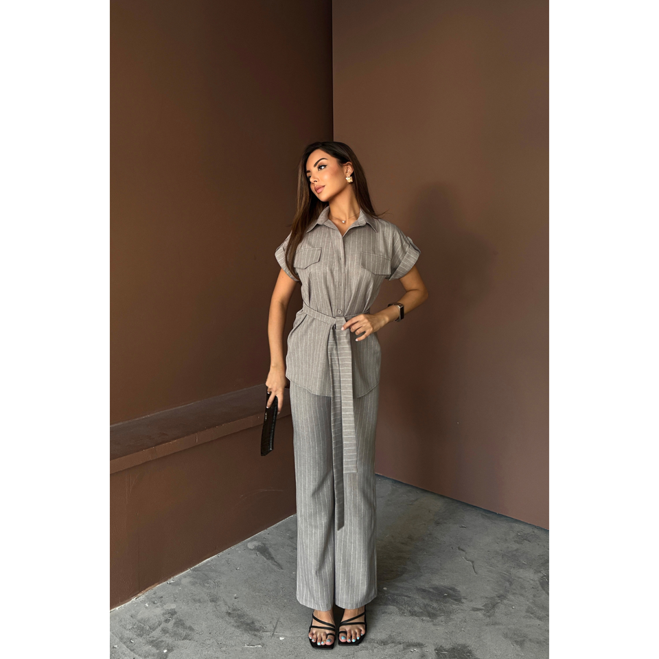 ชุดเสื้อและกางเกงลายทางสีเทาสำหรับผู้หญิง