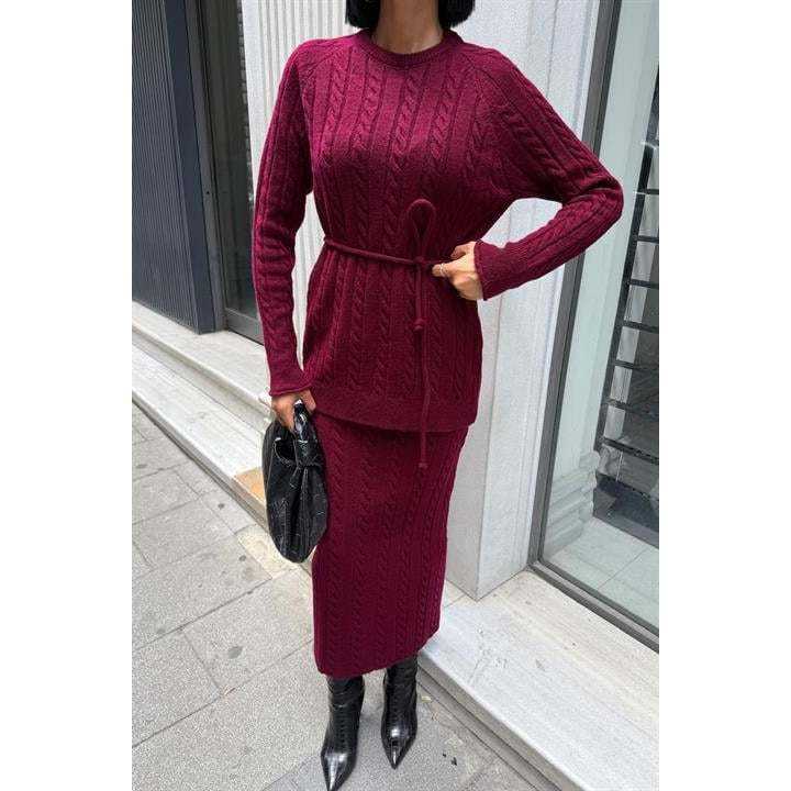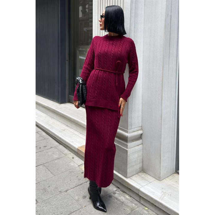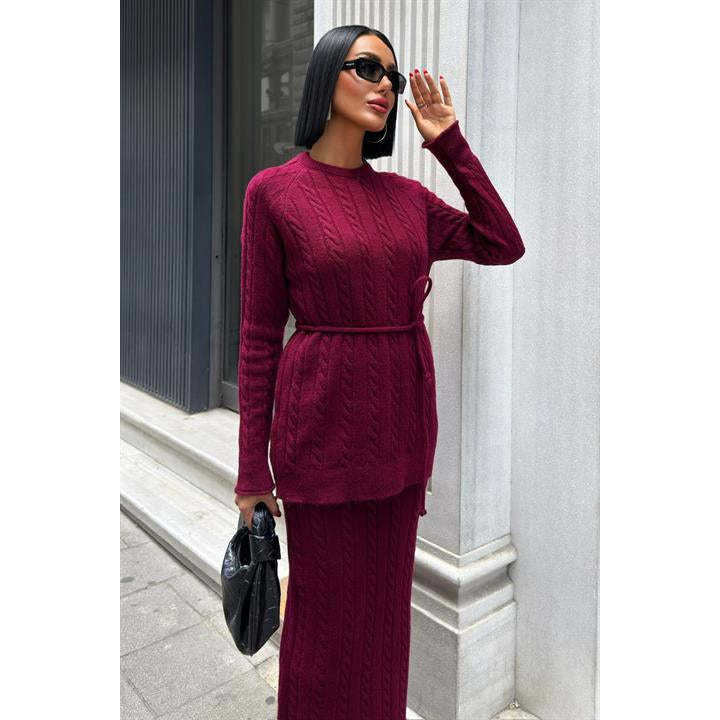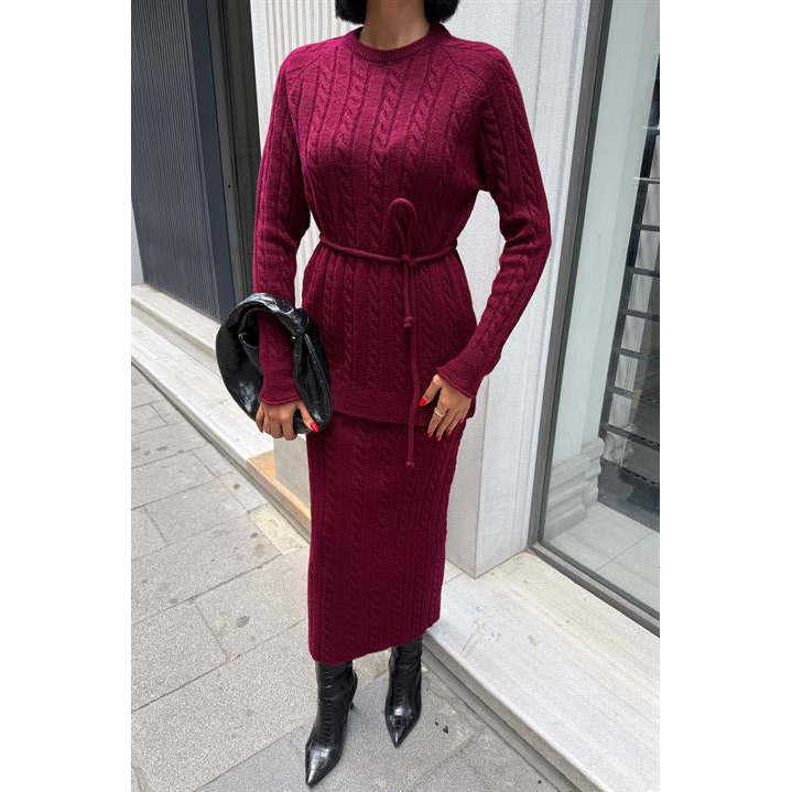 ชุดเสื้อสเวตเตอร์ถักลายถักเปียพร้อมเข็มขัดสำหรับผู้หญิง รุ่น 10218