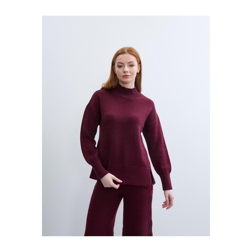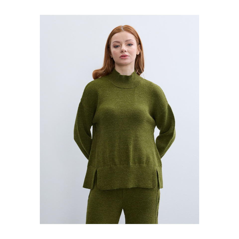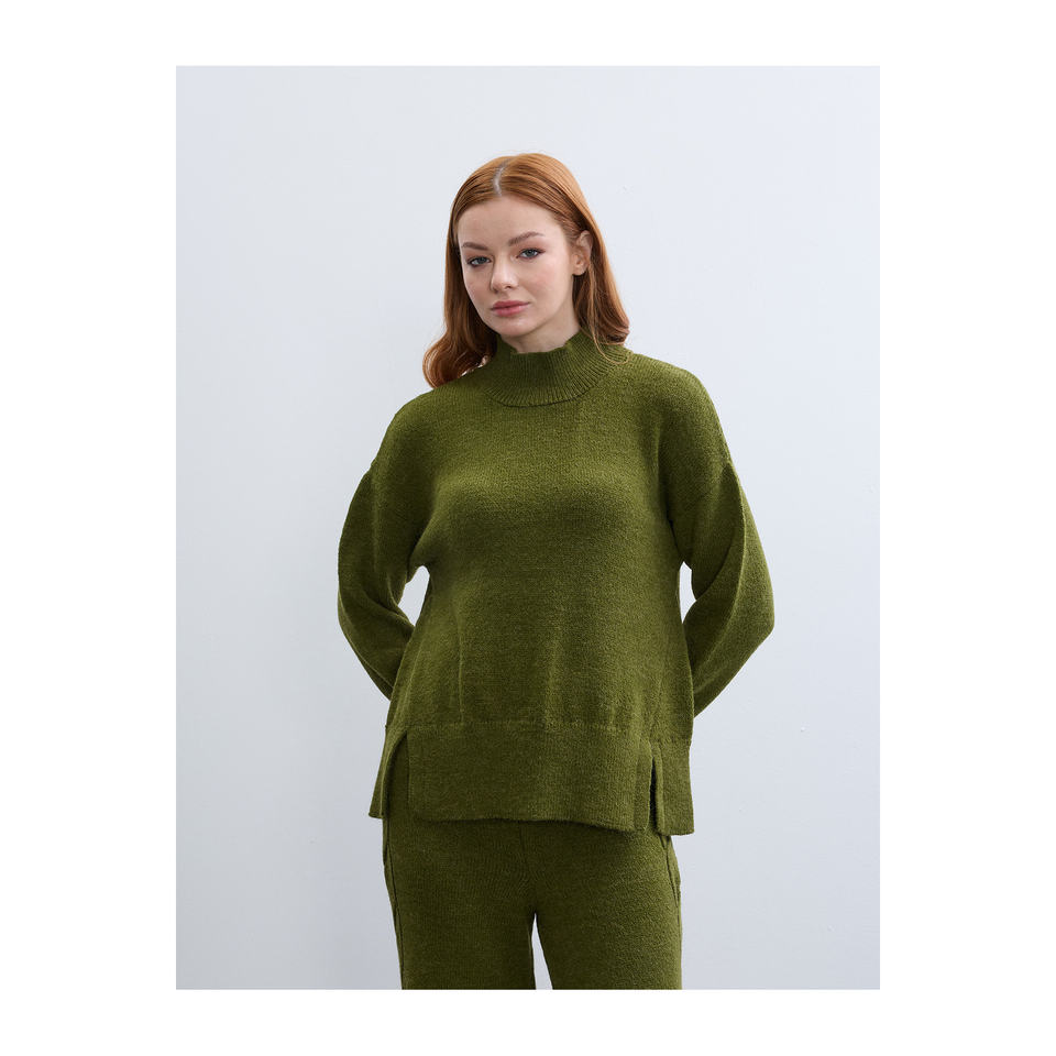 เสื้อสเวตเตอร์คอเต่าครึ่งตัวสำหรับผู้หญิง ดีไซน์เรียบง่าย แต่งดีเทลผ่าข้าง ผ้าเนื้อเสื้อยืดแขนยาว ป้องกันขนร่วง