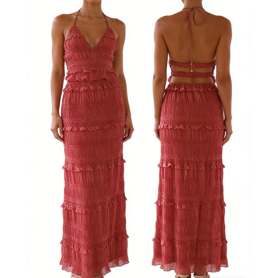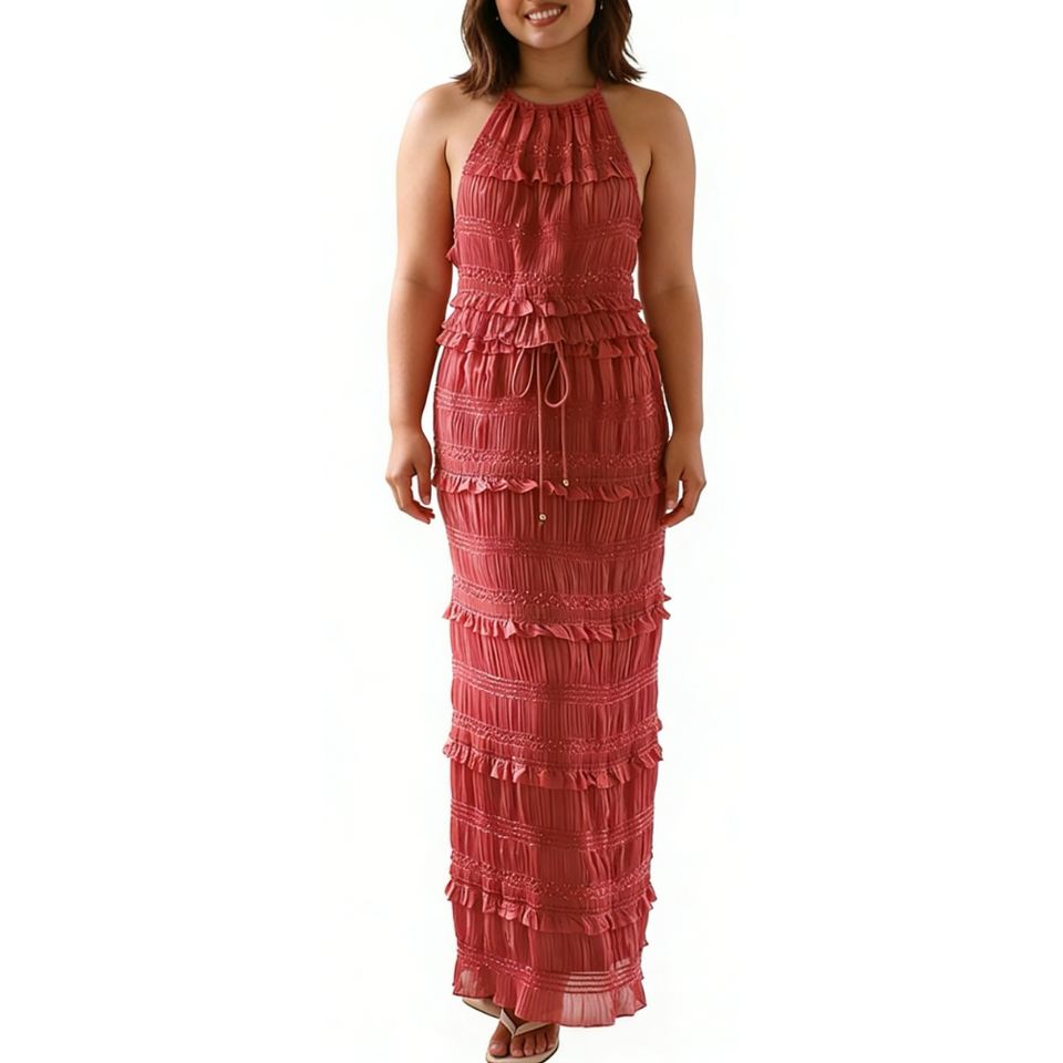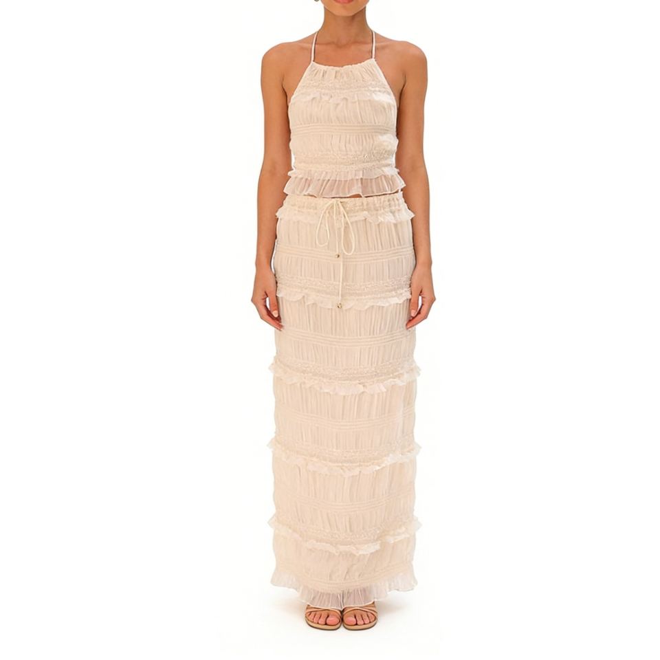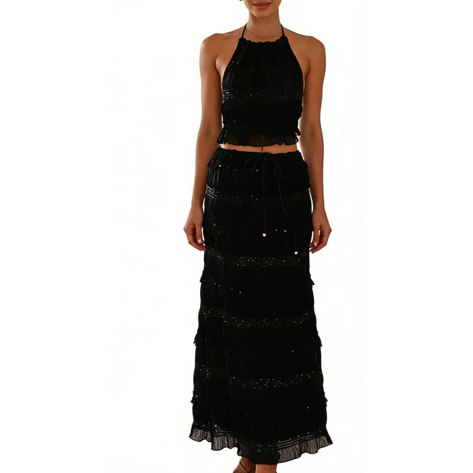 ชุดเซ็ต 2 ชิ้นสำหรับผู้หญิง คอแบบผูกเชือก - กระโปรงยาวระบายเป็นชั้นๆ และเสื้อครอปท็อปแต่งดีเทลวิบวับ แฟชั่น