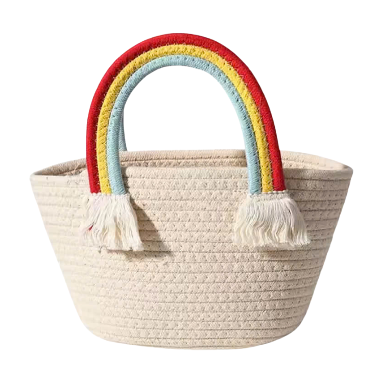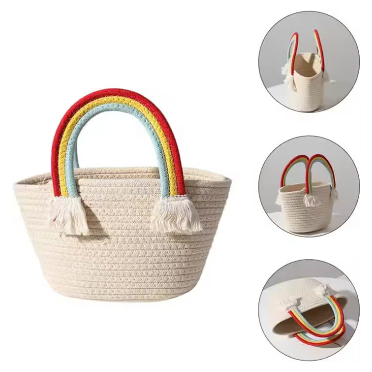 กระเป๋าผ้าถักมือสำหรับผู้หญิงกระเป๋าฤดูร้อนลายโครเชต์มีด้ามจับสีรุ้งทำจากผ้าฝ้ายเวียดนาม