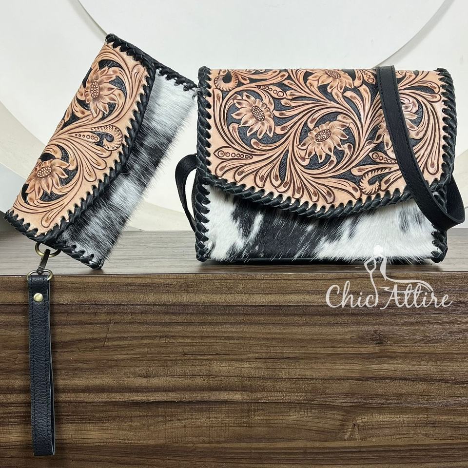ชุดกระเป๋าถือ2ชิ้นหนังแท้สำหรับผู้หญิง, กระเป๋าหนังวัวคาดลำตัวพร้อมกระเป๋าสตางค์ที่เข้ากันชุดกระเป๋าถือหนังแท้สไตล์ตะวันตก