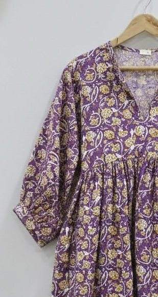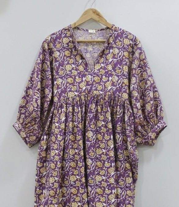 ชุดเดรสผ้าฝ้ายทำมือรักษ์โลกสำหรับผู้หญิง ความยาวปานกลาง 100% ผ้าฝ้าย | ลายดอกไม้ ย้อมสีแบบไทได คอวี แขนพอง ทรงเอไลน์ เอวธรรมชาติ