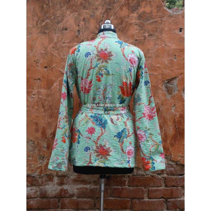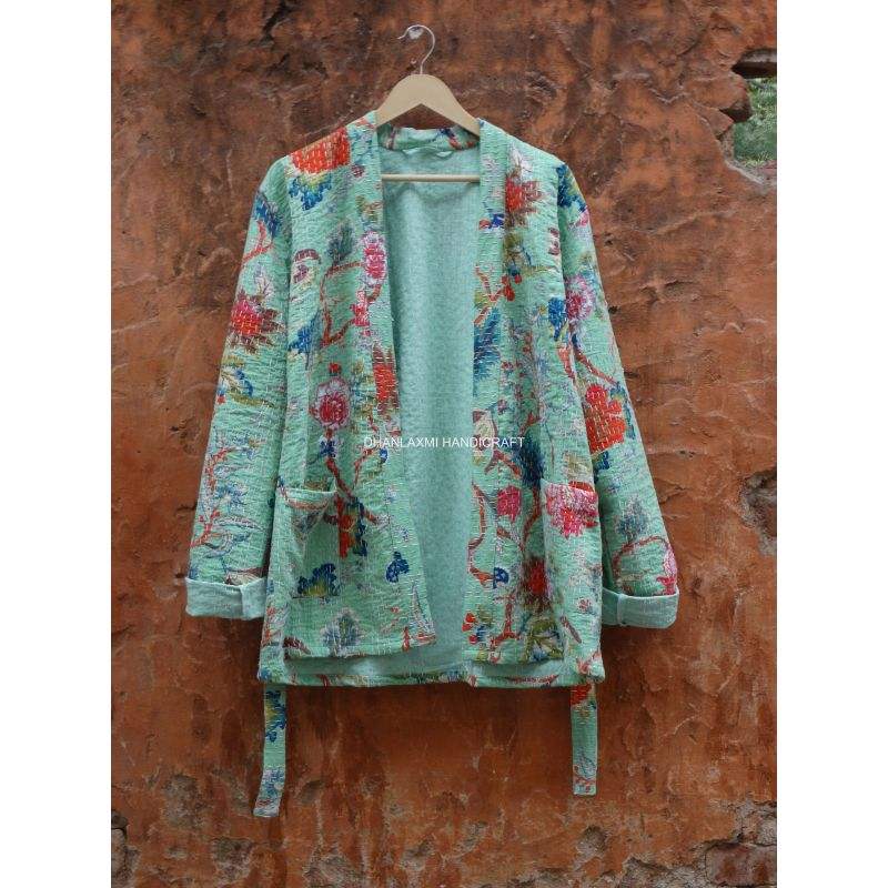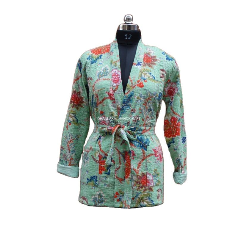 เสื้อแจ็คเก็ต Maxi Kantha สั้นสำหรับผู้หญิงทำด้วยมือลายดอกไม้ผ้าคอตตอน