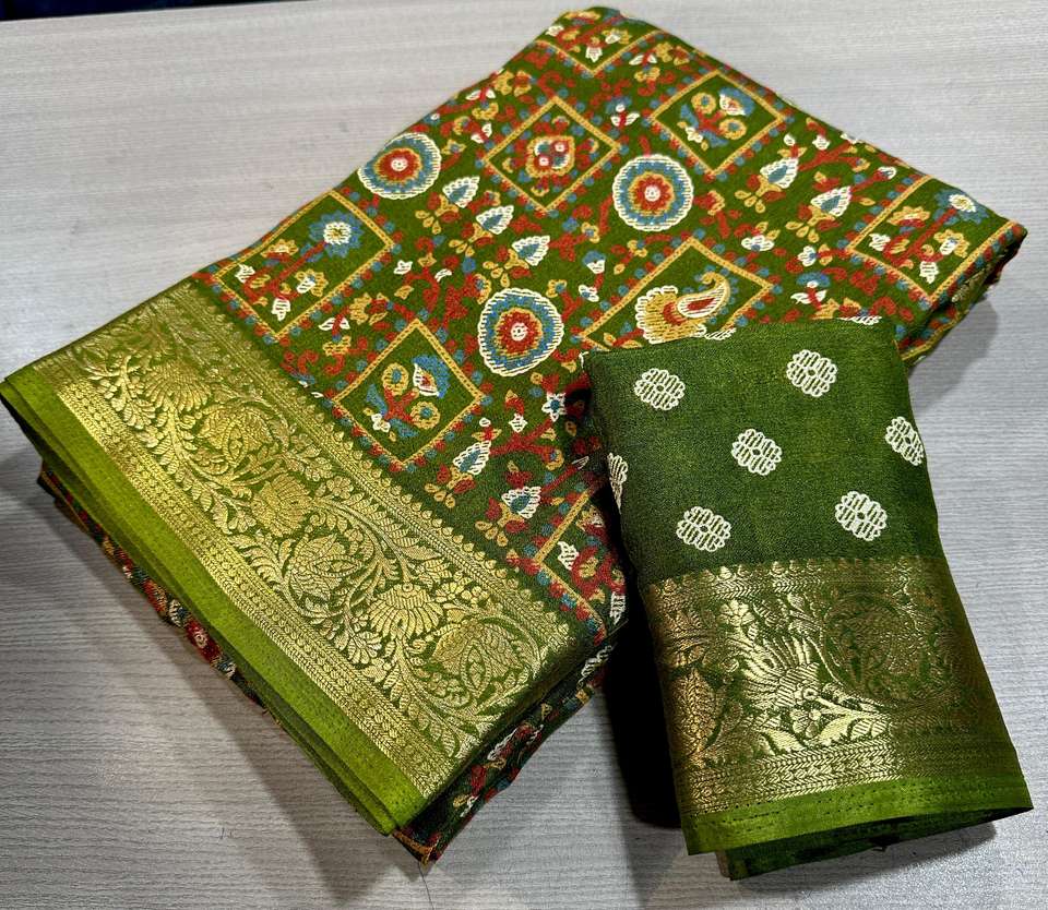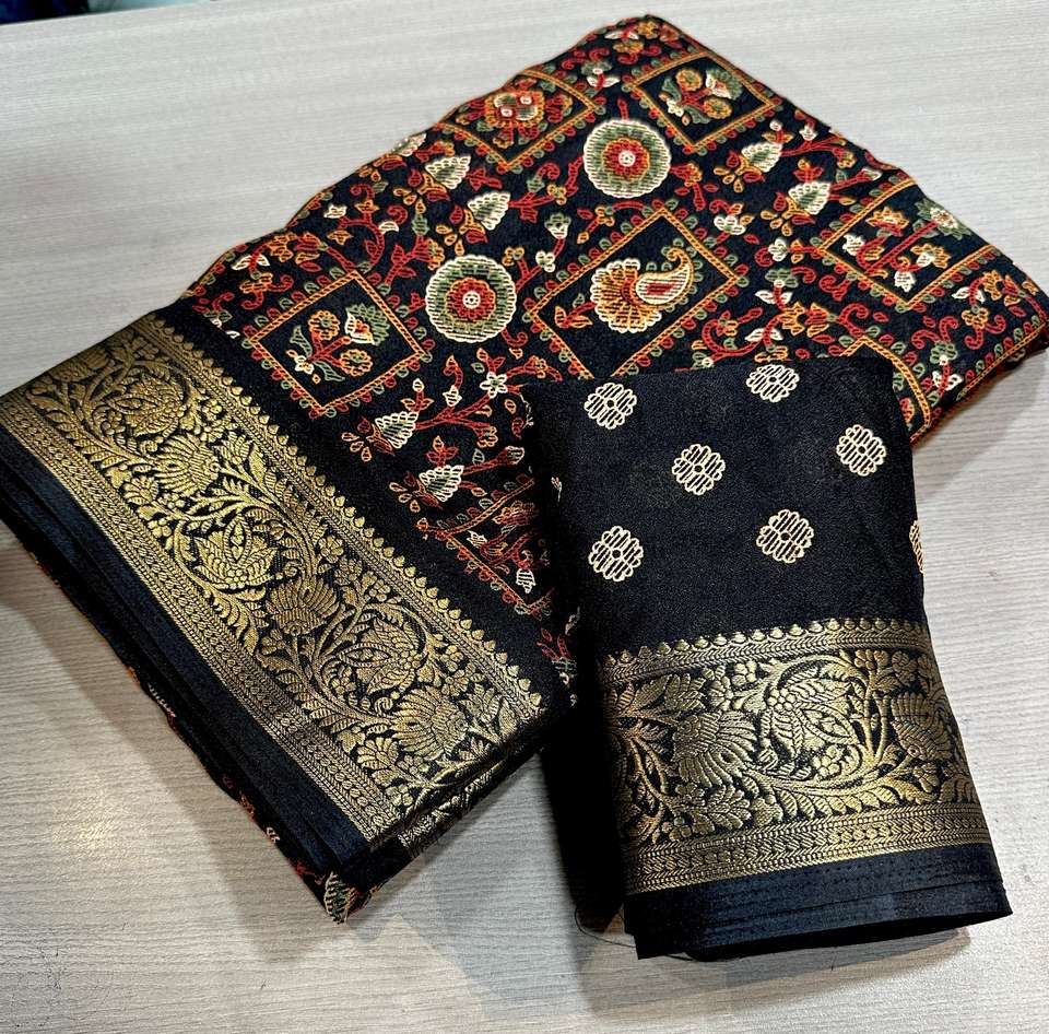ชุดส่าหรีผ้ามาร์ชเมลโลว์เนื้อหนาสำหรับผู้หญิง พร้อมขอบผ้าปักดิ้นทองทั่วทั้งผืน มาพร้อมผ้าคลุมไหล่และเสื้อที่เข้าชุดอย่างลงตัว ผลิตในอินเดีย