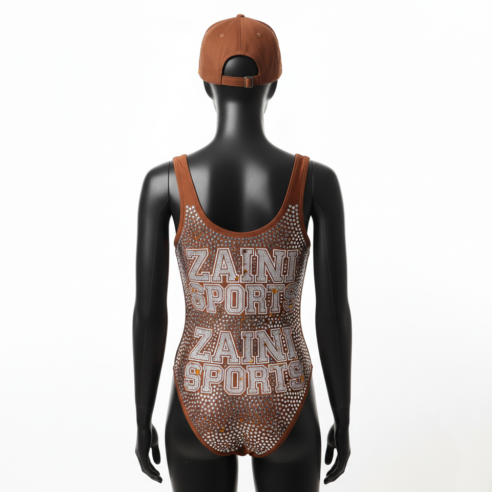 ชุดว่ายน้ำวันพีซสีน้ำตาลสำหรับผู้หญิง ผ้าโพลีสแปนเด็กซ์เนื้อหนา ตกแต่งด้วยกระดุมและโลโก้พิมพ์ลายตามสั่ง