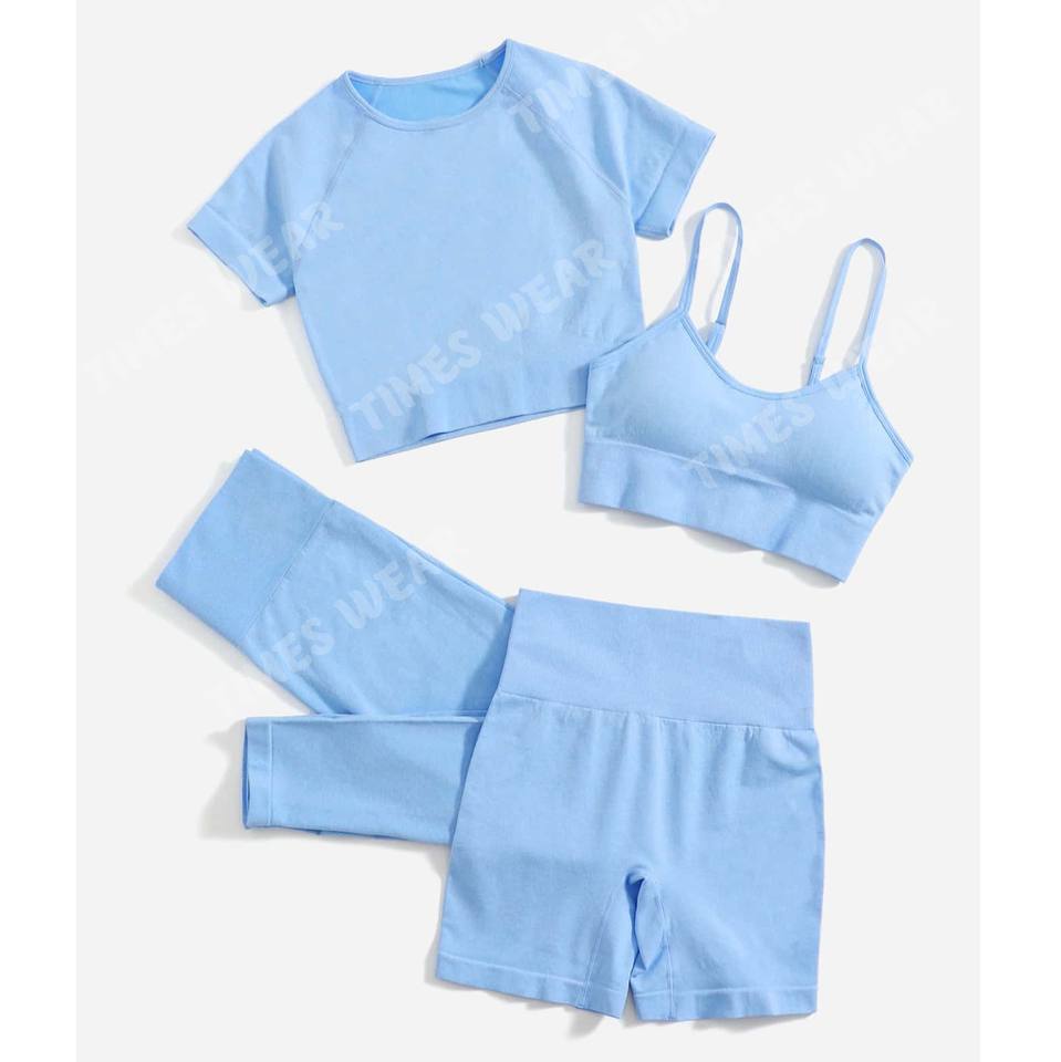 ชุดกีฬาลายสก็อต4ชิ้นคุณภาพสูงของผู้หญิงชุดออกกำลังกายลายสก็อตสีพื้นระบายอากาศไร้รอยต่อและน้ำหนักเบารวมขนาดพิเศษ