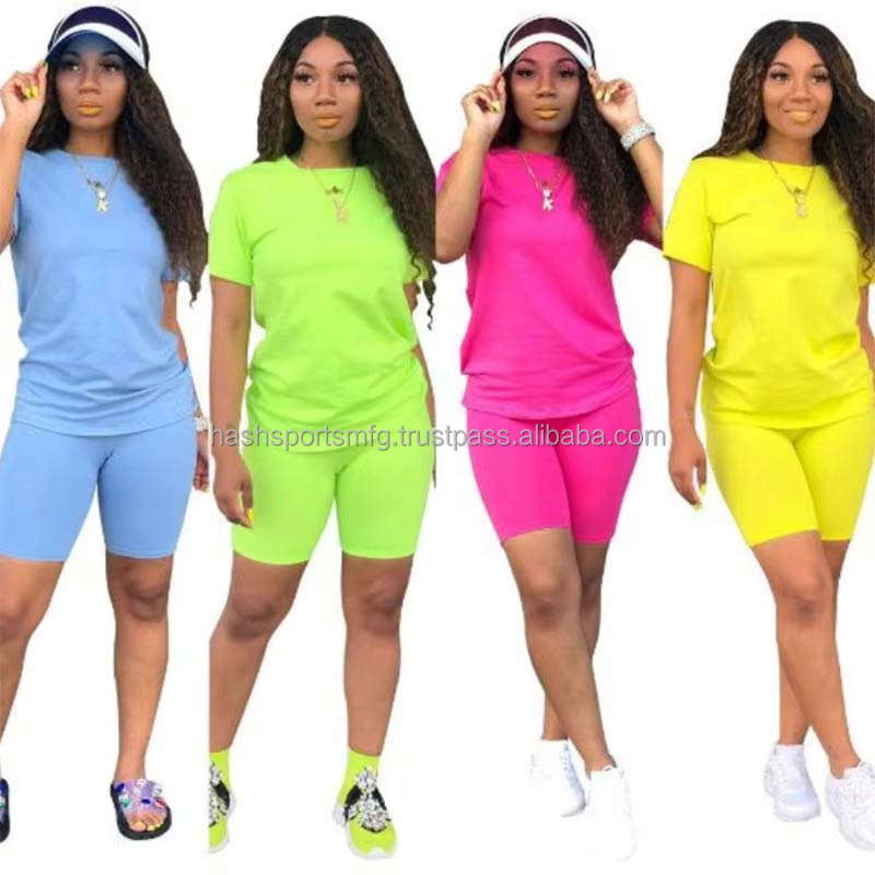ชุดเสื้อยืดกางเกงขาสั้นลำลองสีสันสดใสคุณภาพสูงสำหรับผู้หญิง ผ้าถักพิมพ์โลโก้ตามสั่ง ชุดสองชิ้นขั้นต่ำ 2 ชิ้น
