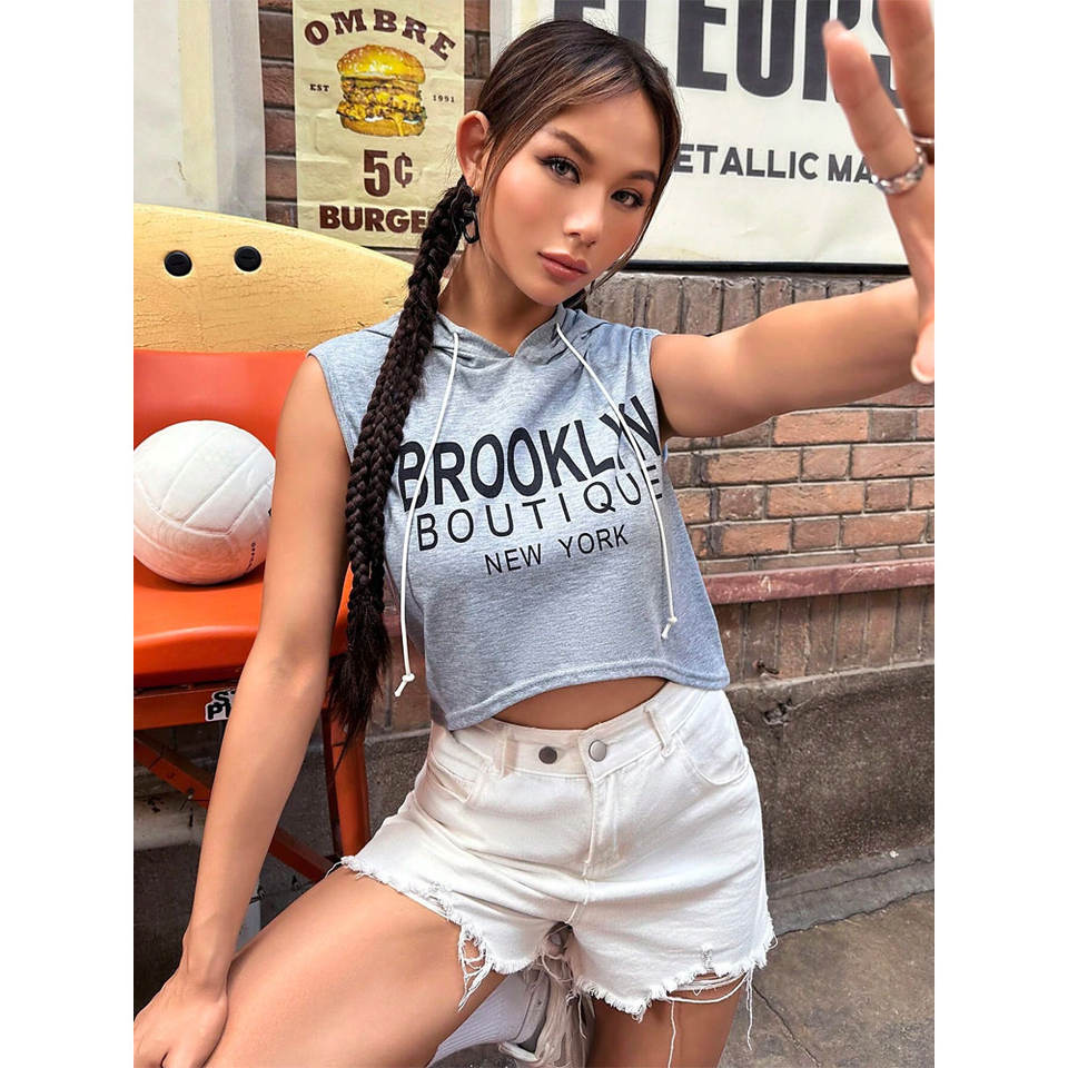เสื้อกันหนาวมีฮู้ดแขนกุดสำหรับผู้หญิงเสื้อกันหนาวมีฮู้ดแขนกุดพิมพ์ลายผ้าโพลีเอสเตอร์ระบายอากาศได้ดีผ้าคอตตอนโพลีเอสเตอร์มีโลโก้ด้านหน้า