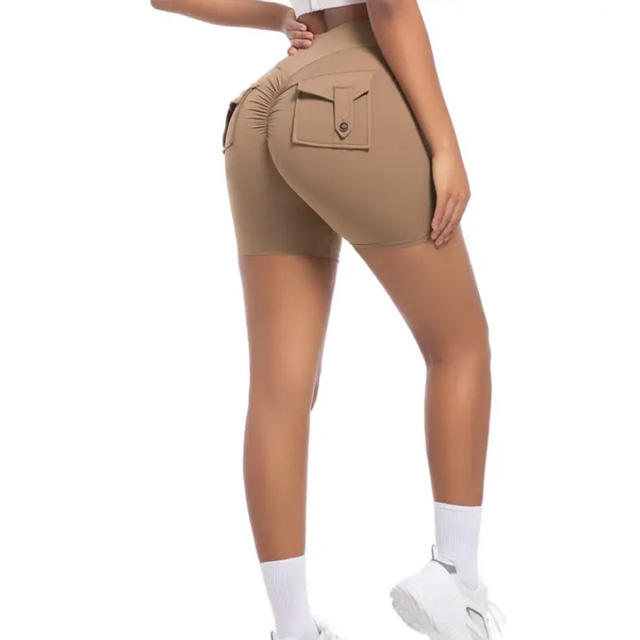 กางเกงขาสั้นเอวสูงสำหรับผู้หญิงกางเกงโยคะแบบกระฉับกระเฉงพิมพ์ลายมีกระดุมยกก้นชุดเล่นฟิตเนสยิมวิ่งพร้อมกระเป๋าหลัง