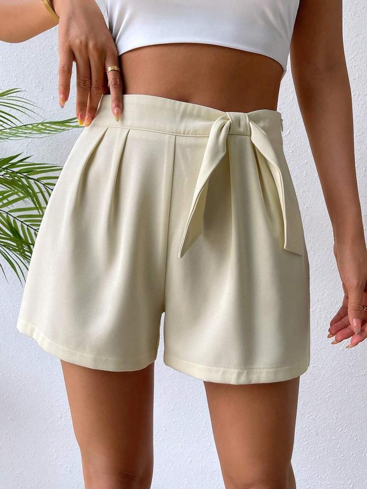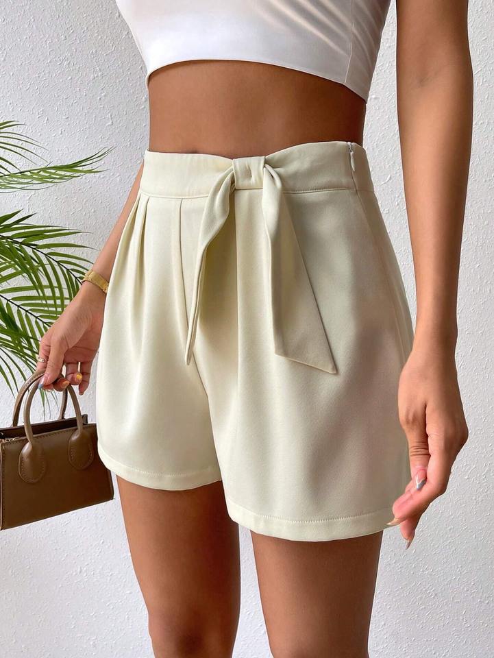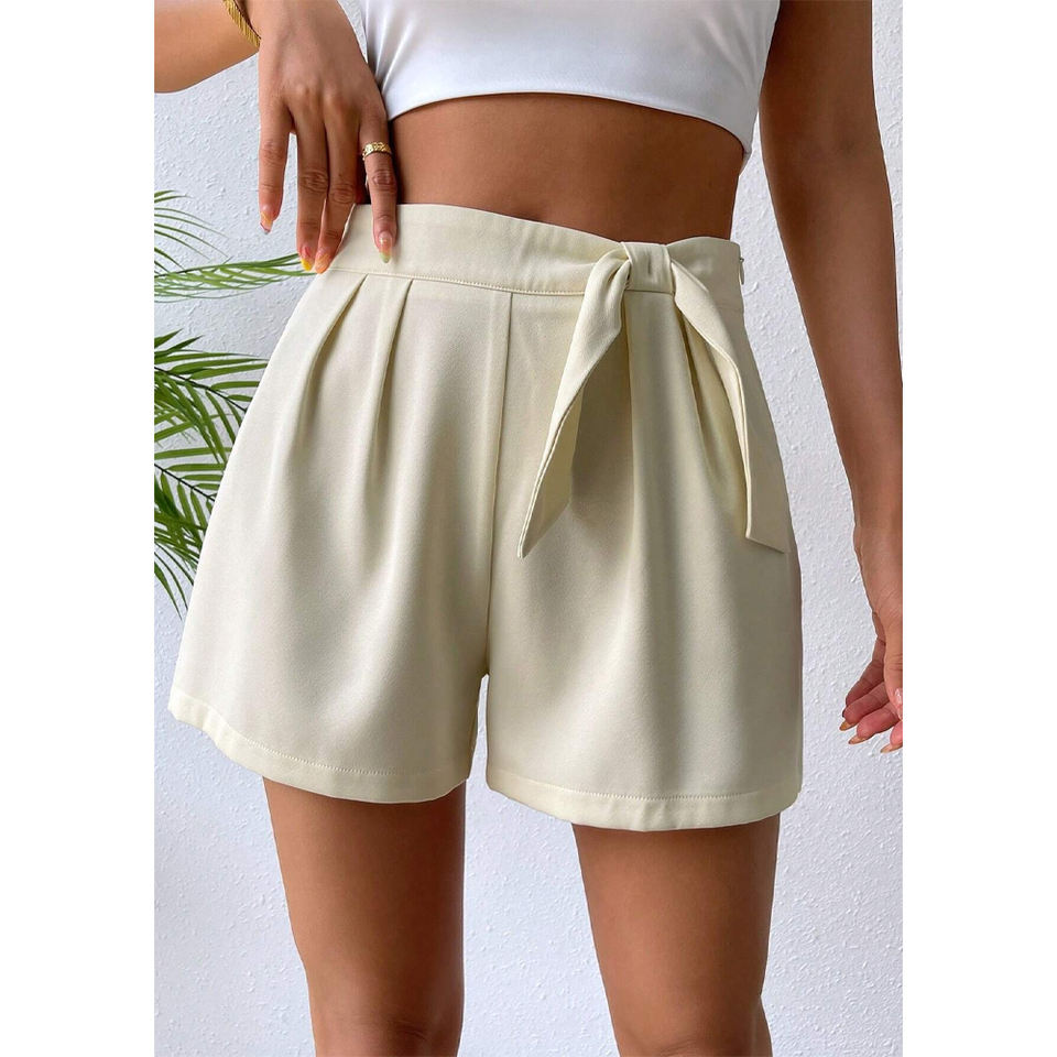 กางเกงขาสั้นเอวสูงระบายอากาศได้ดีสำหรับผู้หญิงกางเกงขาสั้นลำลองผ้าโพลีเอสเตอร์แบบผูกเชือก