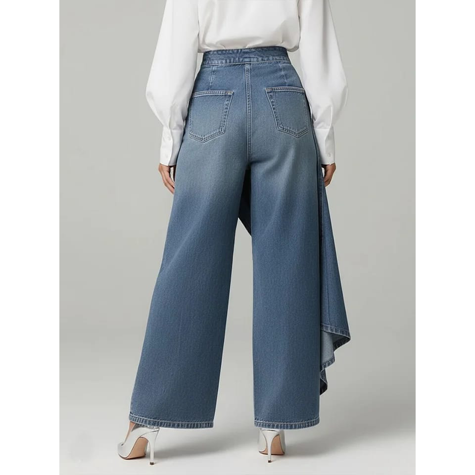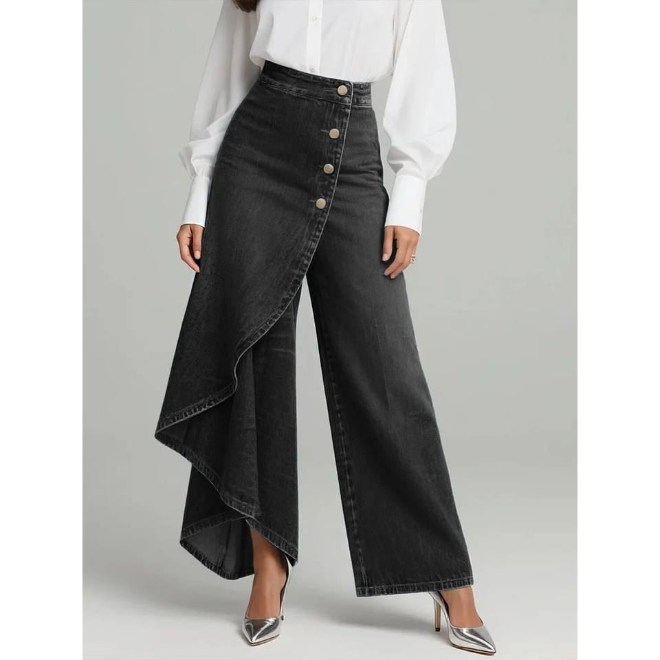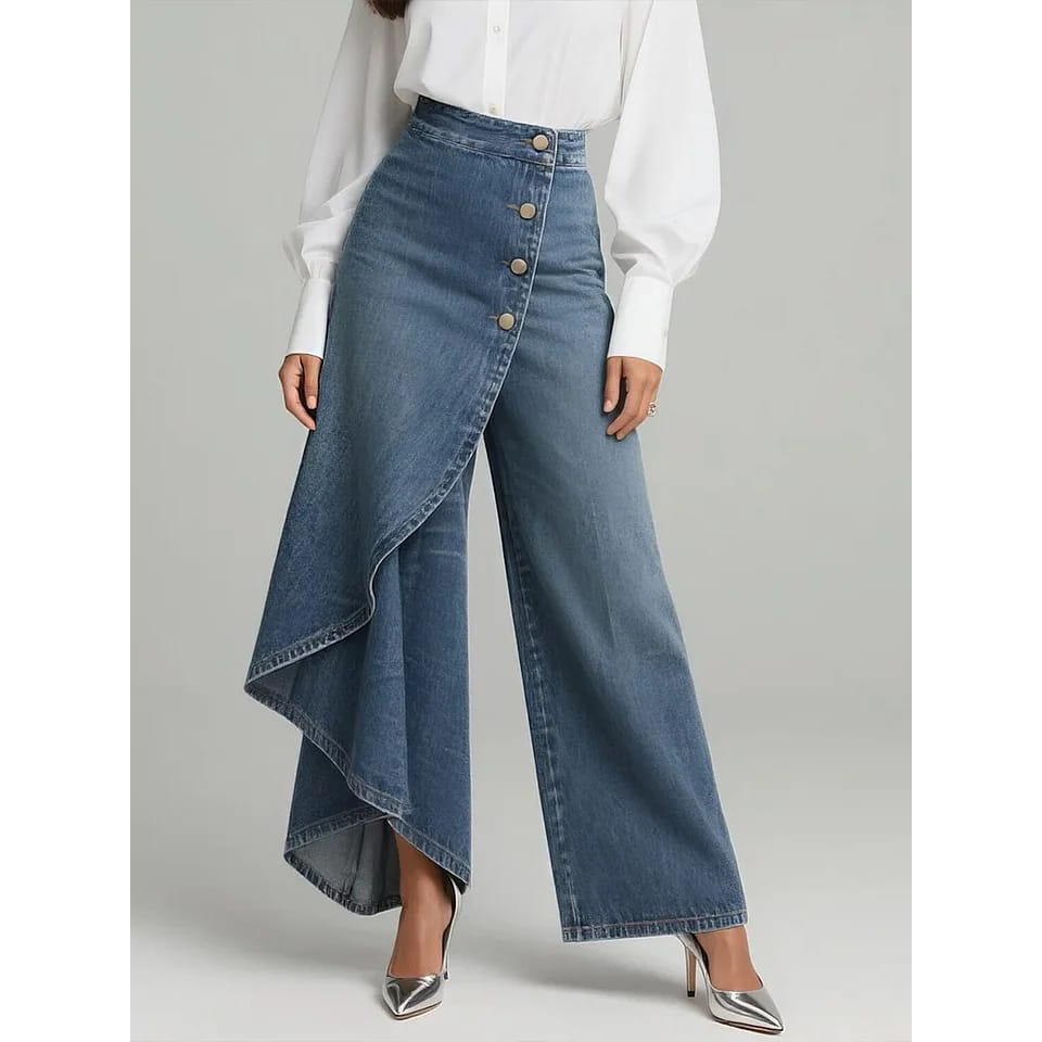 กางเกงเดนิมทรงปาลาซโซ่เอวสูงติดกระดุมแบบไม่สมมาตรสำหรับผู้หญิง