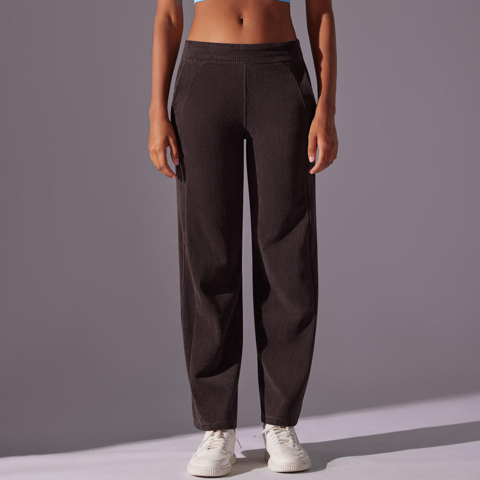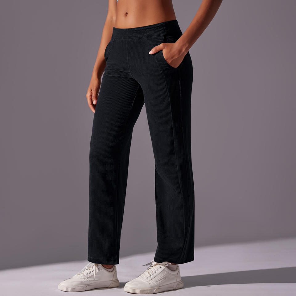 กางเกงผ้าลูกฟูกเอวสูงสำหรับผู้หญิงกางเกงทรงตรงเก้าจุดใส่เล่นกีฬาวิ่งโยคะมีกระเป๋าสีพื้นใหม่