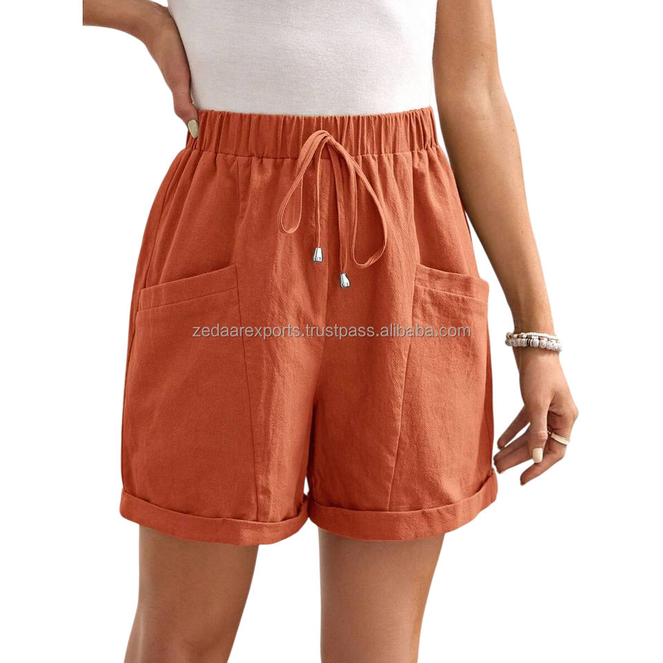 กางเกงขาสั้นผ้าลินินเอวสูงของผู้หญิงกางเกงลำลองระบายอากาศได้ดีในฤดูร้อนกางเกงขาสั้นแบบหลวมดีไซน์ย้อมสีเรียบ