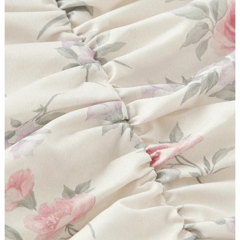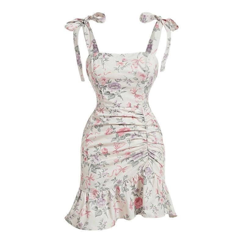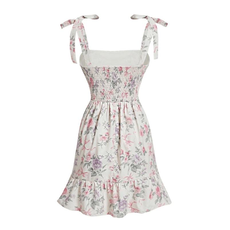เดรสสายเดี่ยวสั้นพิมพ์ลายดอกไม้เอวสูงสำหรับผู้หญิง แต่งระบายด้านหน้า ผ้าฝ้ายฟรีไซส์ สไตล์ลำลอง/วินเทจ/ปาร์ตี้ ปักลาย