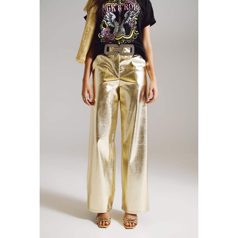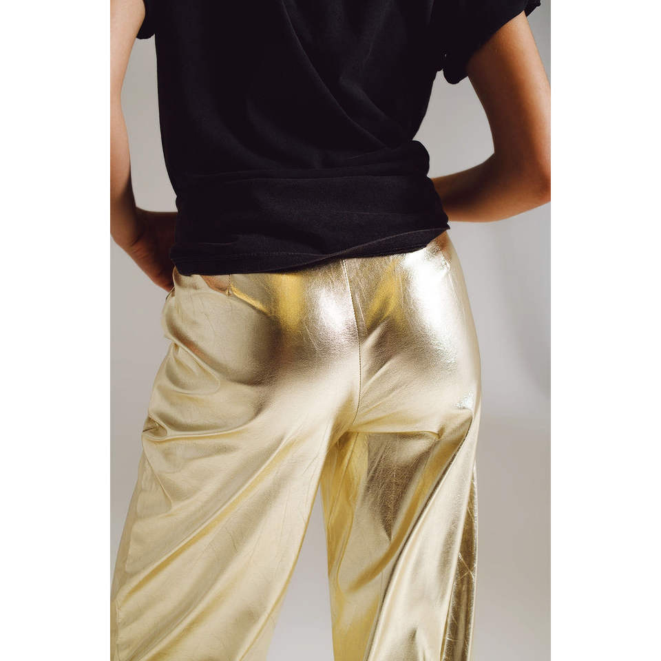 กางเกงคาร์โก้ขายาวทรงตรงเอวสูงสำหรับผู้หญิง สีทอง ผ้า PU ระบายอากาศได้ดี ทรงขากว้าง เทคนิคการยับแบบพิเศษ เหมาะสำหรับฤดูใบไม้ร่วง