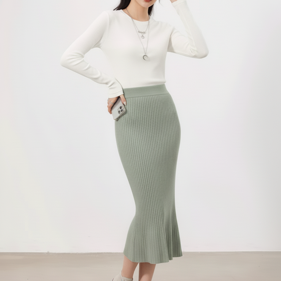 กระโปรงทรงเมอร์เมดเอวสูงสำหรับผู้หญิง ผ้าถักริบบ์ ความยาวปานกลาง สไตล์ลำลองหรูหรา ทรงเอไลน์ ระบายอากาศได้ดี ผ้าเนื้อยืดหยุ่น