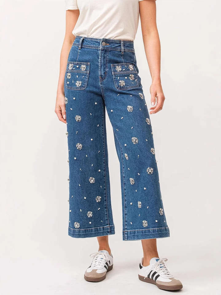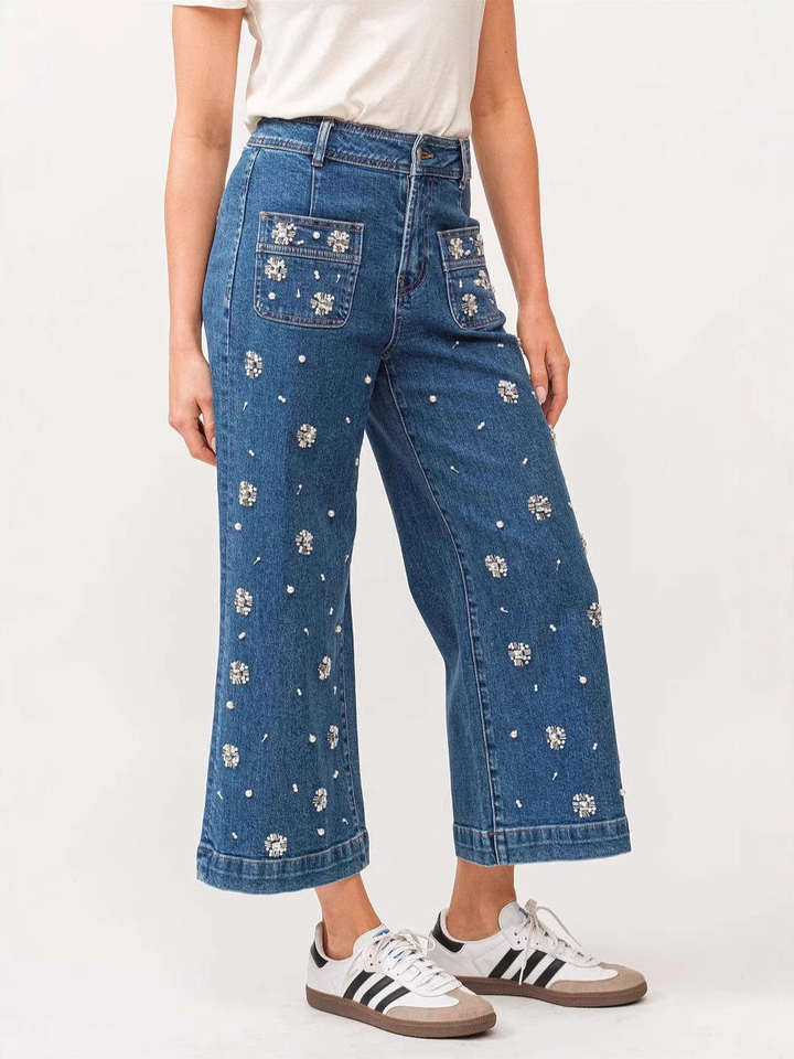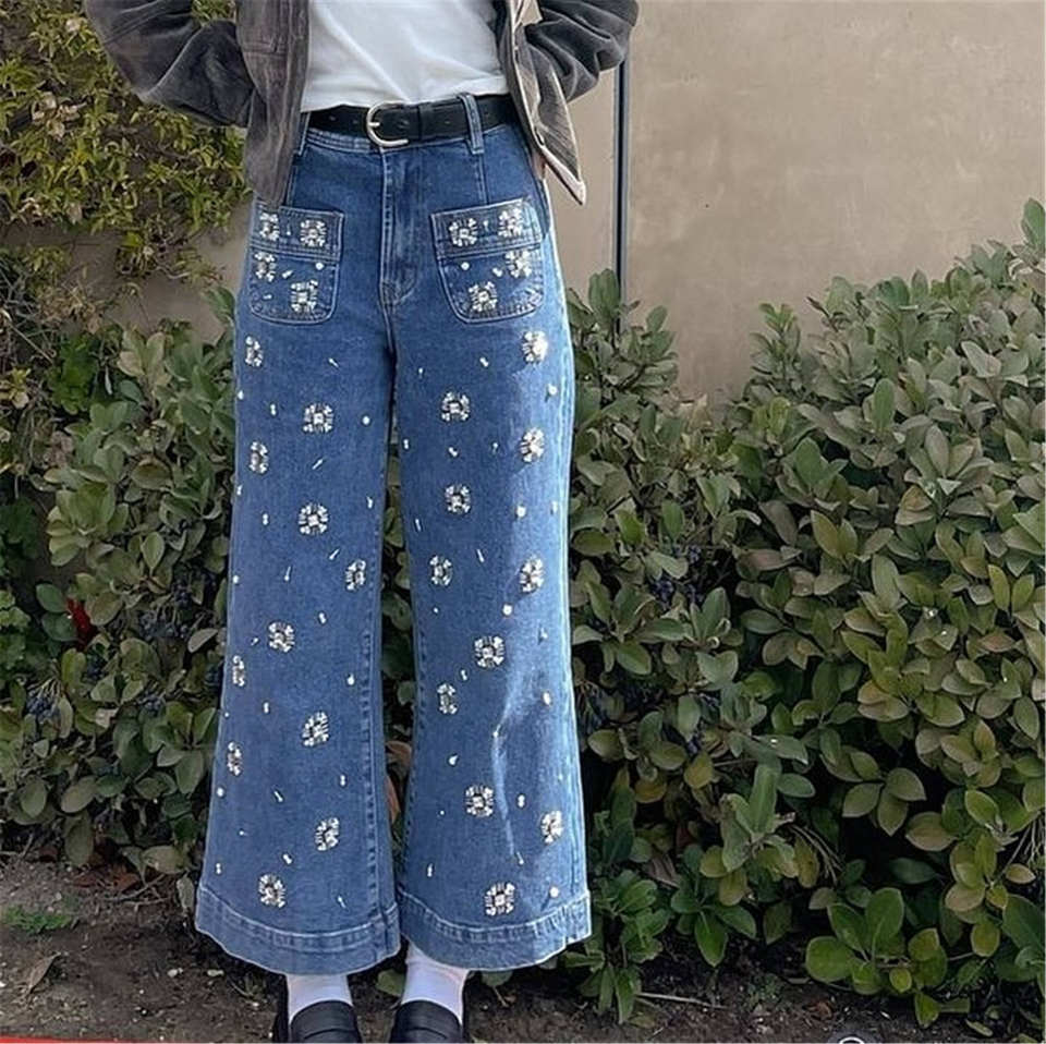 กางเกงยีนส์คาร์โก้ทรงตรงเอวสูงสำหรับผู้หญิง ผ้าฝ้ายผสมโพลีเอสเตอร์ปักลายวินเทจ เป็นมิตรต่อสิ่งแวดล้อม ระบายอากาศได้ดี